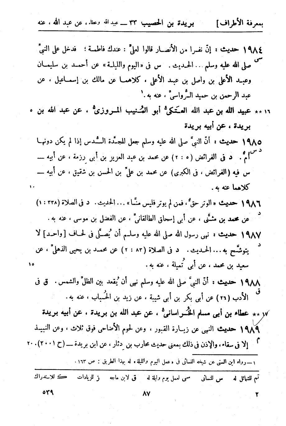1984 -[سي] حديث: إن نفرا من الأنصار قالوا لعلي: عندك فاطمة، فدخل على النبي صَلَّى اللَّهُ عَلَيْهِ وَسَلَّمَ ... الحديث. س في اليوم والليلة عن أحمد بن سليمان وعبد الأعلى بن واصل بن عبد الأعلى، كلاهما عن مالك بن إسماعيل، عن عبد الرحمن بن حميد الرواسي، عنه به1.