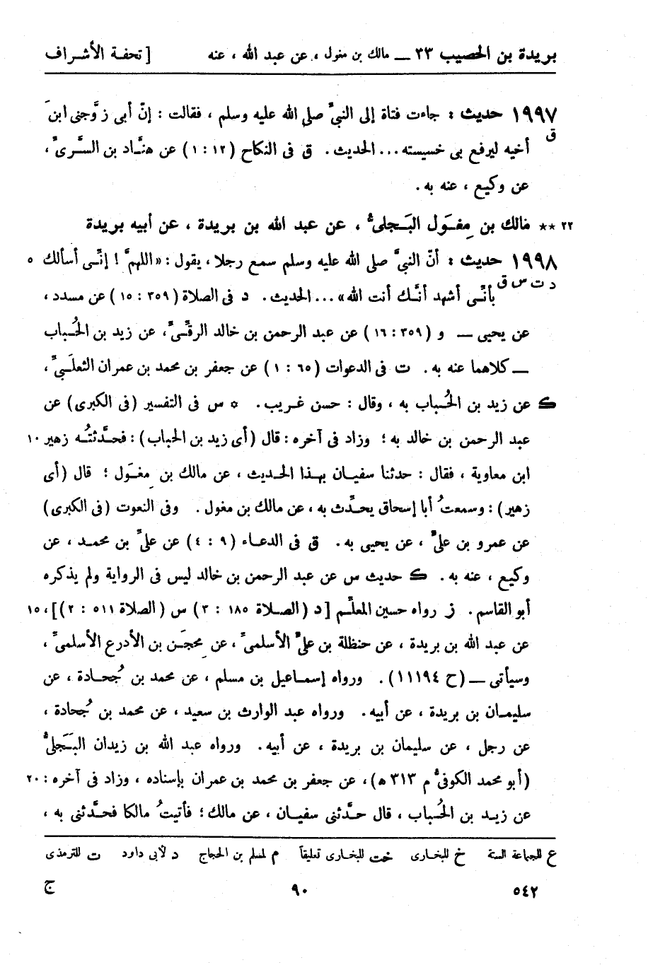 1998 -[د ت س ق] حديث: أن النبي صَلَّى اللَّهُ عَلَيْهِ وَسَلَّمَ سمع رجلا يقول: اللهم! إني أسألك بأني أشهد أنك أنت الله ... الحديث. د في الصلاة (359: 15) عن مسدد، عن يحيى - و (359: 16) عن عبد الرحمن بن خالد الرقي، عن زيد بن الحباب - كلاهما عنه به. ت في الدعوات (65: 1) عن جعفر بن محمد بن عمران الثعلبي، عن زيد بن الحباب به، وقال: حسن غريب. ك س في التفسير (في الكبرى) ، عن عبد الرحمن بن خالد به، وزاد في آخره، قال (أي زيد بن الحباب) : فحدثته زهير بن معاوية فقال: حدثنا سفيان بهذا الحديث، عن مالك بن مغول، قال: (أي زهير) : وسمعت أبا إسحاق يحدث به، عن مالك بن مغول، وفي النعوت (في الكبرى) عن عمرو بن علي، عن يحيى به. ق في الدعاء (9: 4) عن علي بن محمد، عن وكيع، عنه به. (ك) حديث س، عن عبد الرحمن بن خالد ليس في الرواية ولم يذكره أبو القاسم. ز رواه حسين المعلم [د (الصلاة 185: 3) س (الصلاة 511: 2) ] ، عن عبد الله بن بريدة، عن حنظلة بن علي الأسلمي، عن محجن بن الأدرع الأسلمي، وسيأتي - (ح11194) . ورواه إسماعيل بن مسلم، عن محمد بن جحادة، عن سليمان بن بريدة، عن أبيه، ورواه عبد الوارث بن سعيد، عن محمد بن جحادة، عن رجل، عن سليمان بن بريدة، عن أبيه. ورواه عبد الله بن زيدان البجلي (أبو محمد الكوفي م 313 هـ) ، عن جعفر بن محمد بن عمران بإسناده، وزاد في آخره عن زيد بن الحباب، قال حدثني سفيان، عن مالك، فأتيت مالكا فحدثني به، -[91]- ثم حدثت به زهير بن معاوية بعد ذلك بسنتين، فقال: حدثني أبو إسحاق السبيعي، عن مالك بهذا الحديث.