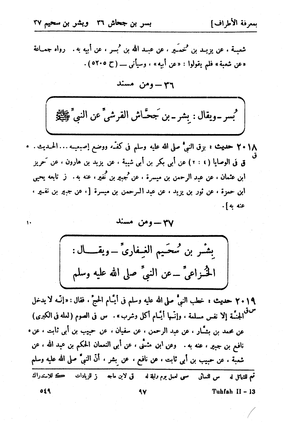 2019 -[س ق] حديث: خطب النبيُّ صَلَّى اللَّهُ عَلَيْهِ وَسَلَّمَ في أيَّام الحجِّ فقال: إنّه لا يدخل الجنَّة إلا نفس مسلمة، وإنّها أيَّام أكل وشرب. س في الصوم (لعله في الكبرى) عن محمد بن بشَّار، عن عبد الرحمن، عن سفيان، عن حبيب بن أبي ثابت، عن نافع بن جبير، عنه به. وعن ابن مثنَّى، عن أبي النعمان الحكم بن عبد الله، عن شعبة، عن حبيب بن أبي ثابت، عن نافع، عن بِشر، أنّ النبيَّ صَلَّى اللَّهُ عَلَيْهِ وَسَلَّمَ -[98]- أمره أن ينادي ... فذكره. و (في الإيمان 7: 3) عن قتيبة، عن حمَّاد، عن عمرو بن دينار، عن نافع بن جبير، عنه مثله. قال (س، لعله في الكبرى) وحدثنا به قتيبة مرَّة أخرى، عن حمَّاد، عن عمرو، عن نافع: أنّ النبيَّ صَلَّى اللَّهُ عَلَيْهِ وَسَلَّمَ أمر منادياً - مرسل - (ح19467) . وعن قتيبة، عن داود العطَّار، عن عمرو، قال: أرسل النبيُّ صَلَّى اللَّهُ عَلَيْهِ وَسَلَّمَ رجلاً يُقال له بِشر ... فذكره - مرسلاً - (ح19131) . وعن يوسف بن عيسى، عن الفضل بن موسى، عن يزيد بن زياد بن أبي الجعد، عن حبيب بن أبي ثابت، عن بشر، قال: سمعتُ النبيَّ صَلَّى اللَّهُ عَلَيْهِ وَسَلَّمَ على المنبر ... فذكره ولم يذكر نافعاً. وعن ابن بشار، عن غندر، عن شعبة، عن عمرو بن دينار، عن نافع بن جبير، عن رجل من أصحاب النبيّ صَلَّى اللَّهُ عَلَيْهِ وَسَلَّمَ، عن النبيّ صَلَّى اللَّهُ عَلَيْهِ وَسَلَّمَ: أنّه بعث بِشر بن سُحَيم، فأمره أن ينادي ... فذكره. ق فيه (الصيام 35: 2) عن أبي بكر بن أبي شيبة وعليِّ بن محمد، كلاهما عن وكيع، عن سفيان به. ز روى [س] عنه، عن عليِّ بن أبي طالب، عن النبيّ صَلَّى اللَّهُ عَلَيْهِ وَسَلَّمَ وسيأتي - (ح10007) .