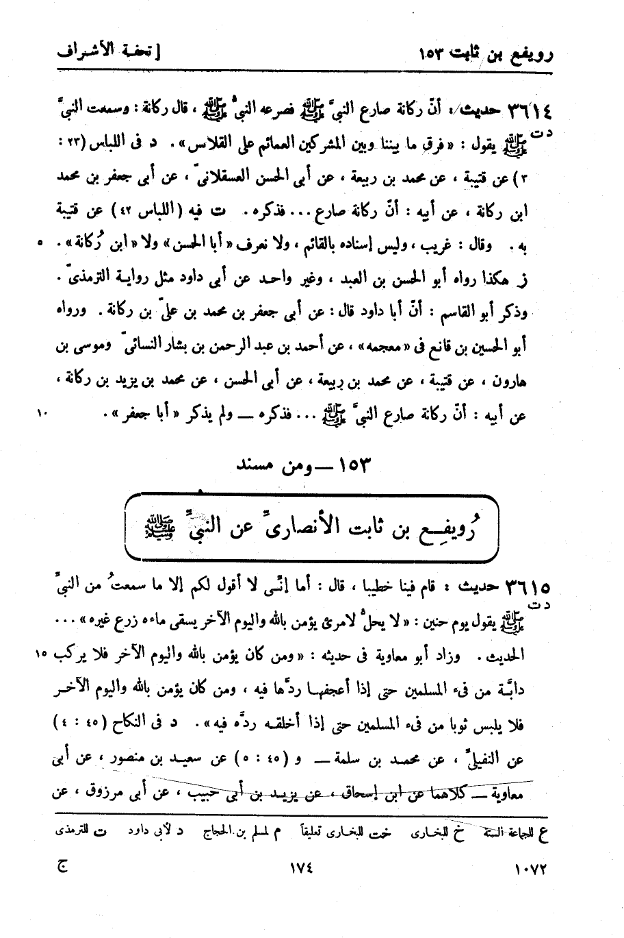 3614 -[د ت] حديث: أنّ ركانة صارع النبيَّ صَلَّى اللَّهُ عَلَيْهِ وَسَلَّمَ فصرعه النبيّ صَلَّى اللَّهُ عَلَيْهِ وَسَلَّمَ، قال ركانة: وسمعت النبيَّ صَلَّى اللَّهُ عَلَيْهِ وَسَلَّمَ يقول: فرق ما بيننا وبين المشركين العمائم على القلانس.