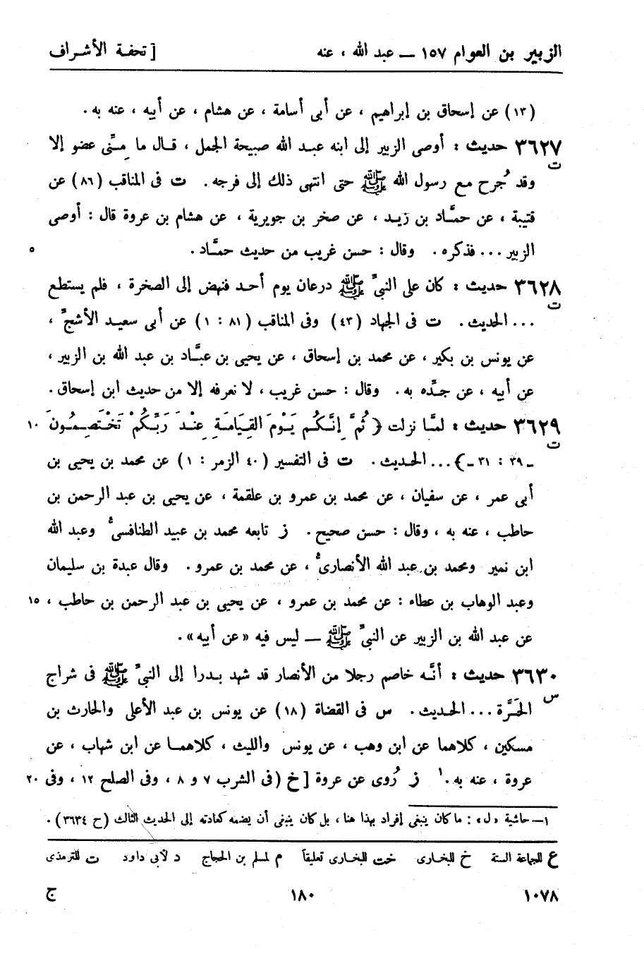 ت في الجهاد (43) وفي المناقب (81: 1) عن أبي سعيد الأشجِّ، عن يونس بن بكير , عن محمد بن إسحاق , عن يحيى بن عبَّاد بن عبد الله بن الزبير , عن أبيه , عن جدِّه به. وقال: حسن غريب , لا نعرفه إلا من حديث ابن إسحاق.