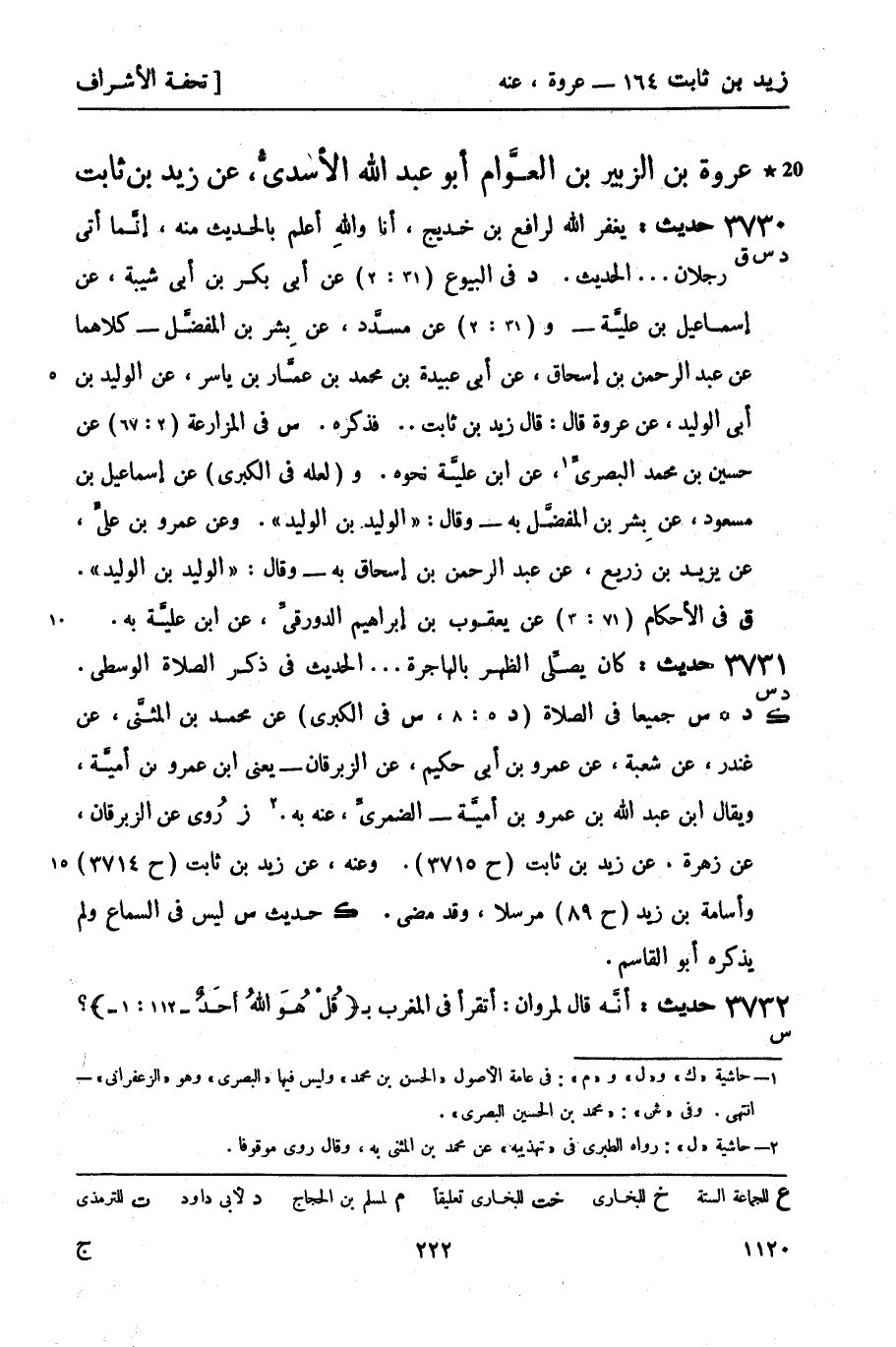 د في البيوع (31: 2) عن أبي بكر بن أبي شيبة، عن إسماعيل ابن علية - و (31: 2) عن مسدَّد , عن بشر بن المفضَّل - كلاهما عن عبد الرحمن بن إسحاق , عن أبي عبيدة بن محمد بن عمَّار بن ياسر , عن الوليد بن أبي الوليد، عن عروة قال: قال زيد بن ثابت ... فذكره.