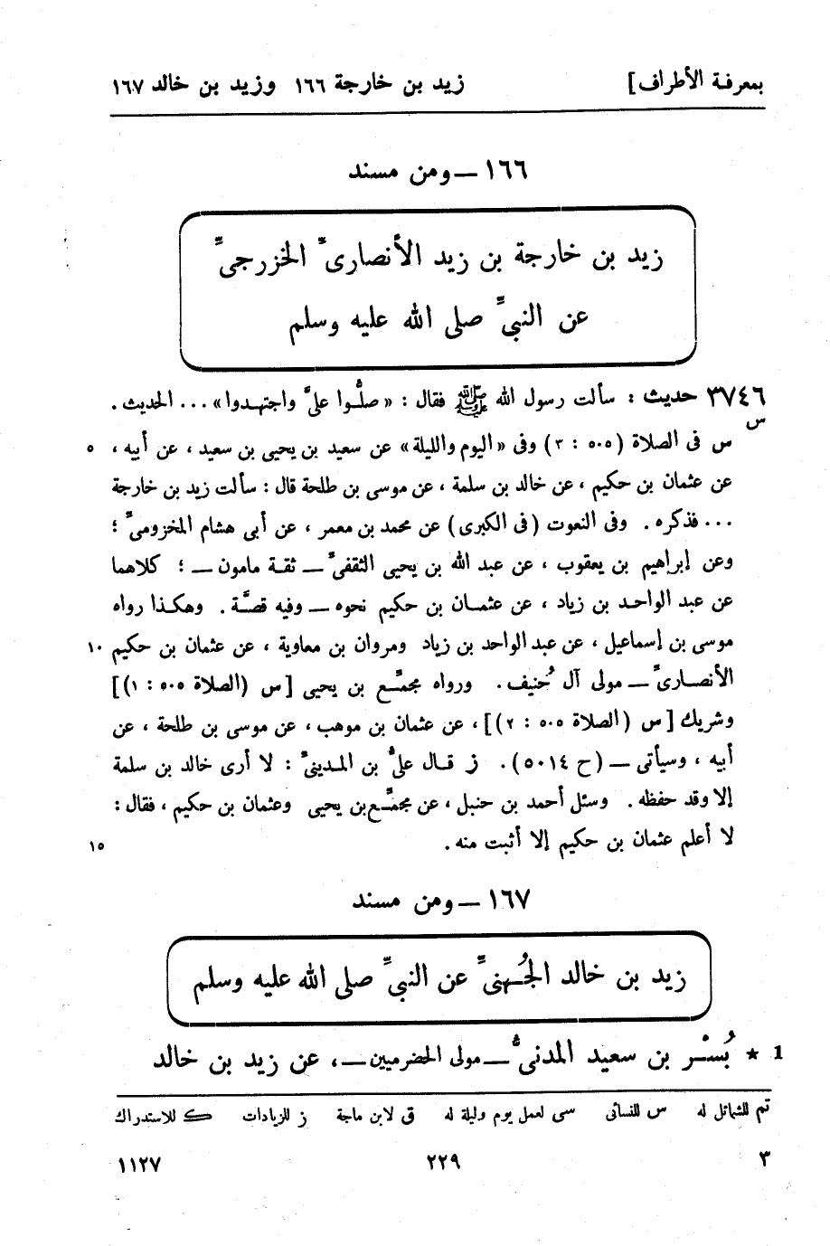س في الصلاة (505: 3) وفي اليوم والليلة عن سعيد بن يحيى بن سعيد , عن أبيه , عن عثمان بن حكيم , عن خالد بن سلمة , عن موسى بن طلحة قال: سألت زيد بن خارجة ... فذكره. وفي النعوت (في الكبرى) عن محمد بن معمر , عن أبي هشام المخزوميِّ؛ وعن إبراهيم بن يعقوب , عن عبد الله بن يحيى الثقفيِّ - ثقة مأمون -؛ كلاهما عن عبد الواحد بن زياد , عن عثمان بن حكيم نحوه - وفيه قصَّة. وهكذا رواه موسى بن إسماعيل , عن عبد الواحد بن زياد ومروان بن معاوية , عن عثمان بن حكيم الأنصاريِّ - مولى آل حُنيف. ورواه مجمِّع بن يحيى [س (الصلاة 505: 1) ] وشريك [س (الصلاة 505: 2) ] , عن عثمان بن موهب , عن موسى بن طلحة , عن أبيه , وسيأتي - (ح 5014) . (ز) قال عليُّ بن المدينيِّ: لا أرى خالد بن سلمة إلا وقد حفظه. وسئل أحمد بن حنبل , عن مجمِّع بن يحيى وعثمان بن حكيم، فقال: لا أعلم عثمان بن حكيم إلا أثبت منه.