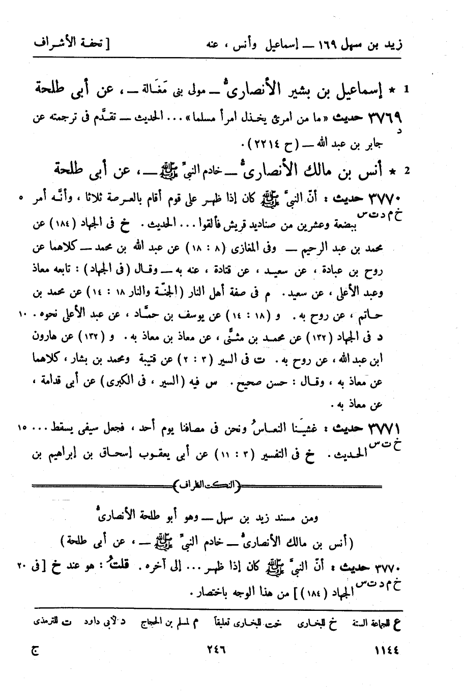 خ في الجهاد (184) عن محمد بن عبد الرحيم - وفي المغازي (8: 18) عن عبد الله بن محمد - كلاهما عن روح بن عبادة , عن سعيد , عن قتادة , عنه به - وقال (في الجهاد) : تابعه معاذ وعبد الأعلى , عن سعيد. م في صفة أهل النار (الجنّة والنار 18: 14) عن محمد بن حاتم , عن روح به. و (18: 14) عن يوسف بن حمَّاد , عن عبد الأعلى نحوه.