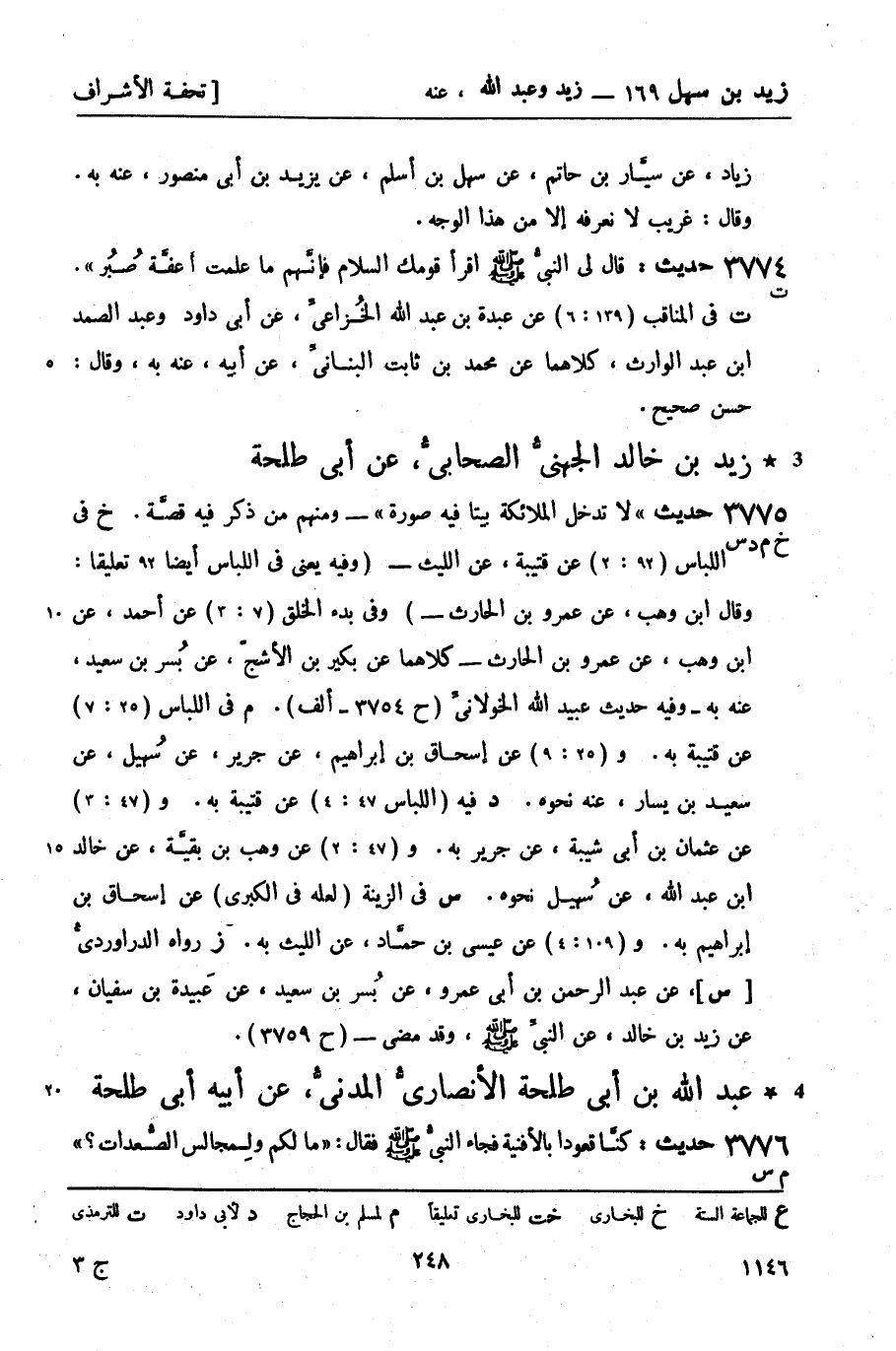 3775 -[خ م د س] حديث لا تدخل الملائكة بيتاً فيه صورة - ومنهم من ذكر فيه قصَّة.
