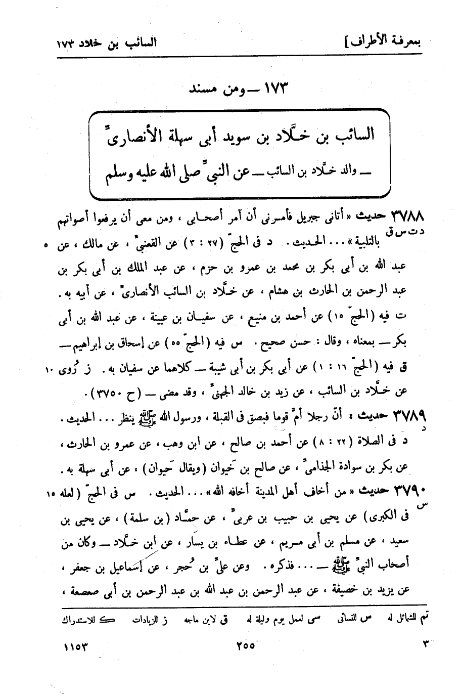 س في الحجّ (لعله في الكبرى) عن يحيى بن حبيب بن عربيَ , عن حمَّاد (بن سلمة) , عن يحيى بن سعيد , عن مسلم بن أبي مريم , عن عطاء بن يسار , عن ابن خلاَّد - وكان من أصحاب النبيّ صَلَّى اللَّهُ عَلَيْهِ وَسَلَّمَ - ... فذكره. وعن عليِّ بن حُجر , عن إسماعيل بن جعفر , عن يزيد بن خصيفة , عن عبد الرحمن بن عبد الله بن عبد الرحمن بن أبي صعصعة، -[256]- عن عطاء , أنّ السائب بن خلاَّد - أخا بلحارث بن الخزرج - بنحوه. (ز) رواه حجَّاج بن إبراهيم الأزرق , عن إسماعيل بن جعفر , عن يزيد بن خصيفة , عن عبد الله بن عبد الرحمن بن أبي صعصعة. وكذلك رواه الحميديُّ , عن عبد العزيز بن أبي حازم , عن يزيد بن خصيفة. (ورواه أحمد في مسنده ج4: ص55 و56 , بسند مختلفة , عن السائب) . 174 - ومن مسند السائب بن أبي السائب العابديِّ المخزوميِّ - شريك النبيِّ صَلَّى اللَّهُ عَلَيْهِ وَسَلَّمَ في الجاهليَّة؛ وهو والد عبد الله بن السائب - عن النبي صَلَّى اللَّهُ عَلَيْهِ وَسَلَّمَ