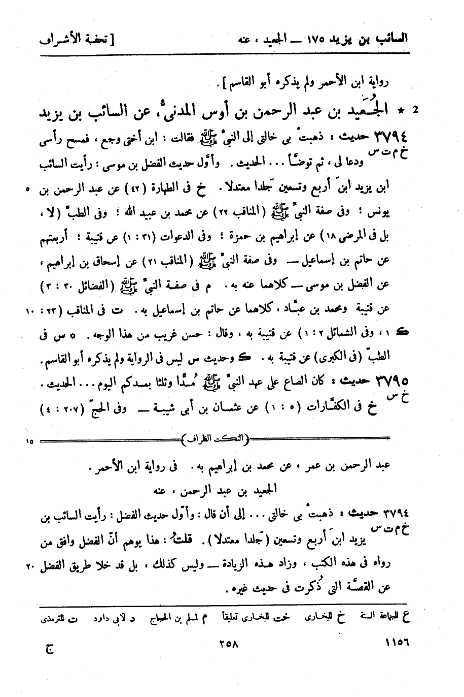 3794 -[خ م ت س] حديث: ذهبتْ بي خالتي إلى النبي صَلَّى اللَّهُ عَلَيْهِ وَسَلَّمَ فقالت: ابن أختي وجع , فمسح رأسي ودعا لي , ثم توضَّأ ... الحديث. وأوَّل حديث الفضل بن موسى: رأيت السائب بن يزيد ابن أربع وتسعين جَلداً معتدلاً.