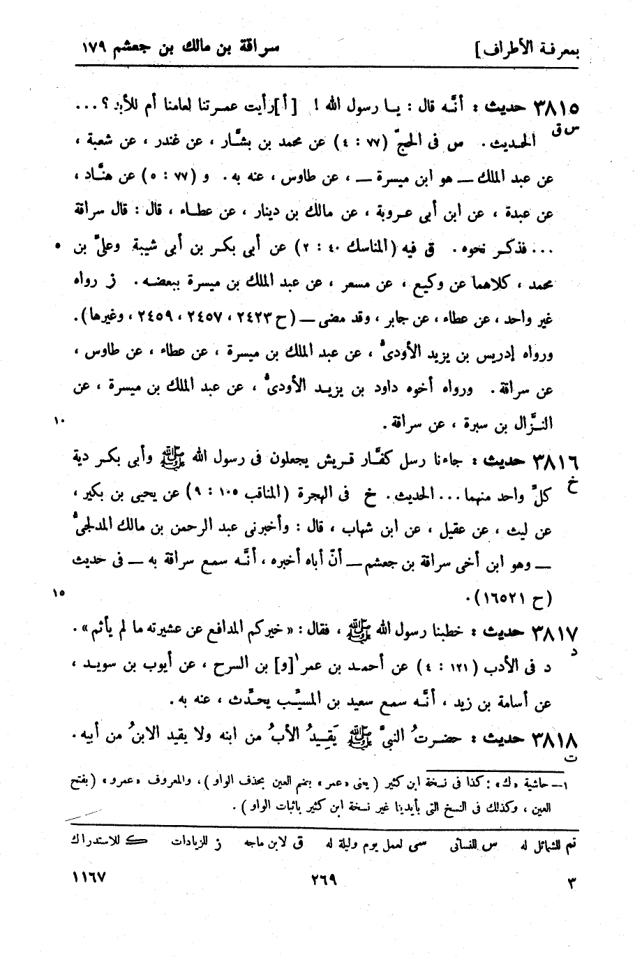 س في الحجّ (77: 4) عن محمد بن بشَّار , عن غندر , عن شعبة , عن عبد الملك - وهو ابن ميسرة - , عن طاوس , عنه به. و (77: 5) عن هنَّاد , عن عبدة , عن ابن أبي عروبة , عن مالك بن دينار , عن عطاء , قال: قال سراقة ... فذكر نحوه.