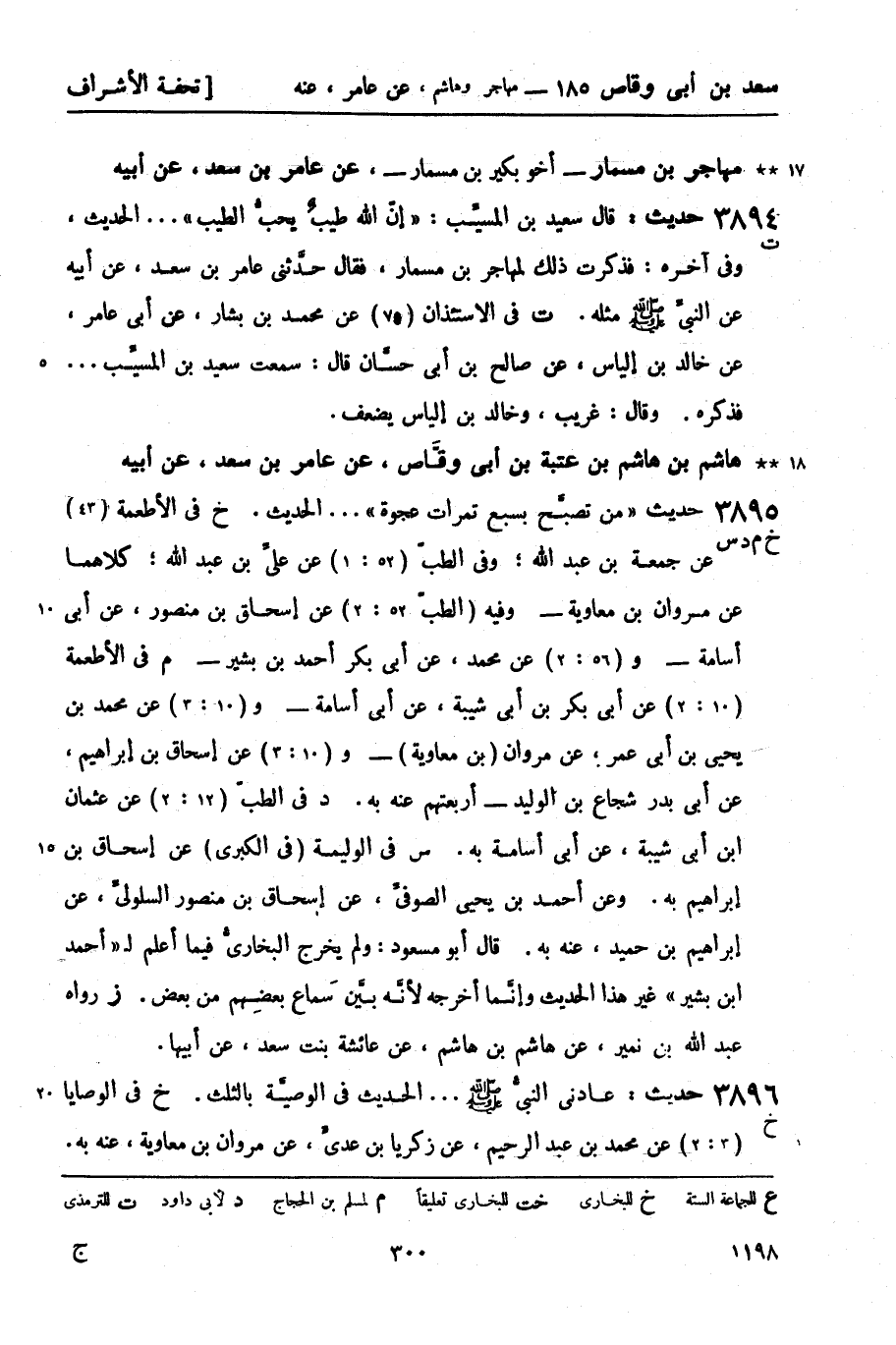 س في الوليمة (في الكبرى) عن إسحاق بن إبراهيم به. وعن أحمد بن يحيى الصوفيِّ , عن إسحاق بن منصور السلوليِّ , عن إبراهيم بن حميد , عنه به. قال أبو مسعود: ولم يخرج البخاريُّ فيما أعلم ل أحمد بن بشير غير هذا الحديث وإنَّما أخرجه لأنَّه بيَّن سَماع بعضِهم من بعض. (ز) رواه عبد الله بن نمير , عن هاشم بن هاشم , عن عائشة بنت سعد , عن أبيها.