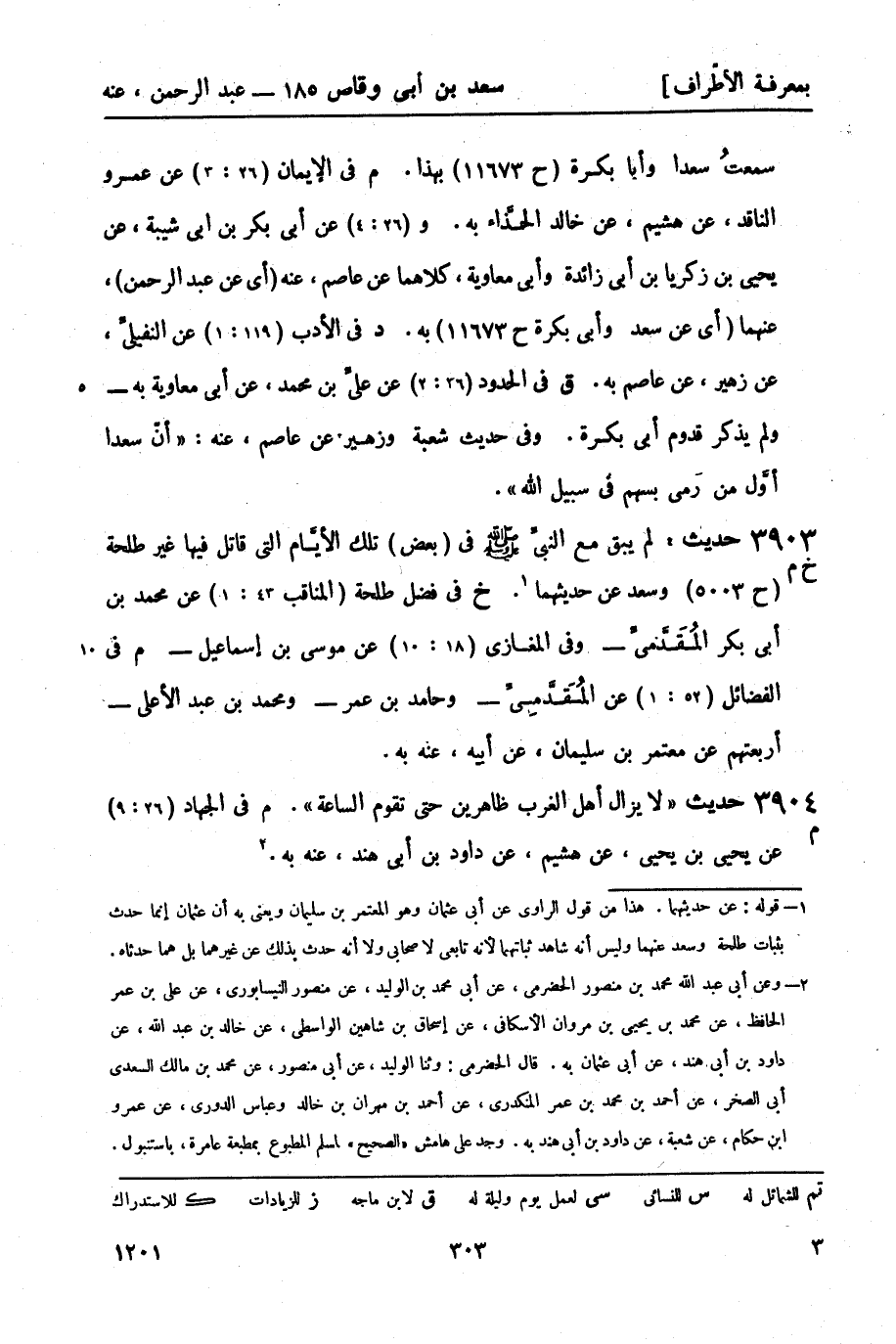 3903 -[خ م] حديث: لم يبق مع النبيِّ صَلَّى اللَّهُ عَلَيْهِ وَسَلَّمَ في (بعض) تلك الأيَّام التي قاتل فيها غير طلحة (ح 5003) وسعد عن حديثهما1.