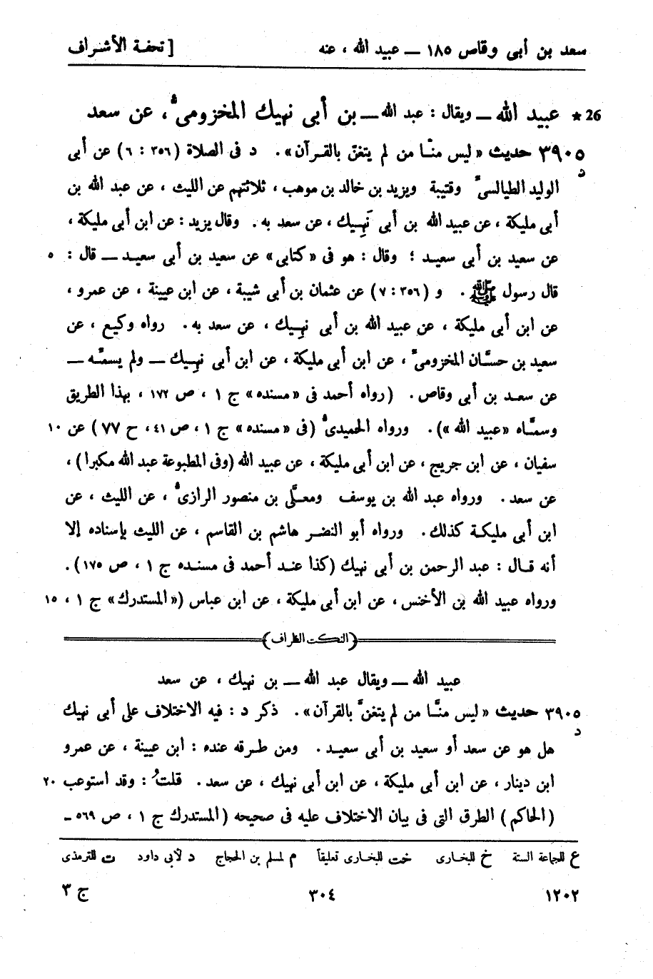 د في الصلاة (356: 6) عن أبي الوليد الطيالسيِّ وقتيبة ويزيد بن خالد بن موهب , ثلاثتهم عن الليث , عن عبد الله بن أبي مليكة , عن عبيد الله بن أبي نَهِيك , عن سعد به , وقال يزيد: عن ابن أبي مليكة، عن سعيد بن أبي سعيد؛ وقال: هو في كتابي عن سعيد بن أبي سعيد - قال: قال رسول الله صَلَّى اللَّهُ عَلَيْهِ وَسَلَّمَ. و (356: 7) عن عثمان بن أبي شيبة , عن ابن عيينة , عن عمرو , عن ابن أبي مليكة , عن عبيد الله بن أبي نهِيك , عن سعد به. رواه وكيع , عن سعيد بن حسَّان المخزوميِّ , عن ابن أبي مليكة , عن ابن أبي نهِيك - ولم يسمِّه - عن سعد بن أبي وقاص. (رواه أحمد في مسنده ج1، ص 172 , بهذا الطريق وسماه عبيد الله) . ورواه الحميديُّ (في مسنده ج 1، ص 41، ح 77) عن سفيان , عن ابن جريج , عن ابن أبي مليكة , عن عبيد الله (وفي المطبوعة عبد الله مكبراً) , عن سعد. ورواه عبد الله بن يوسف ومعلَّى بن منصور الرازيُّ , عن الليث , عن بن أبي مليكة كذلك. ورواه أبو النضر هاشم بن القاسم , عن الليث بإسناده إلا أنه قال: عبد الرحمن بن أبي نهيك (كذا عند أحمد في مسنده ج 1، ص 175) . ورواه عبيد الله بن الأخنس , عن ابن أبي مليكة , عن ابن عباس (المستدرك ج -[305]- 1، ص 570) ورواه عسل بن سفيان , عن ابن أبي مليكة , عن عائشة (المستدرك ج 1، ص 570) . ورفعاه وهماً جميعاً وهمٌ , والصحيح حديث سعد. (ز) ورواه أحمد بن حنبل وسُريج بن النعمان , عن سفيان بن عيينة , عن عمرو بن دينار , عن ابن أبي مليكة , عن عبيد الله بن أبي نهيك , عن سعد. ورواه شبابة بن سوَّار وشعيب بن الليث بن سعد , عن الليث بن سعد مثل رواية عبد الله بن يوسف ومعلَّى بن منصور. ورواه أبو صالح عبد الله بن صالح كاتب الليث , عن الليث , عن أبي مليكة , عن عبيد الله بن أبي نهيك , عن سعيد بن أبي سعيد عن رسول الله صَلَّى اللَّهُ عَلَيْهِ وَسَلَّمَ , وقال: قال لنا الليث بالعراق: عن سعد بن أبي وقاص , وأمَّا ههنا - يعني بمصر - فكذا قال , وكذا في أصل كتابه. ورواه شبابة أيضاً عن الحُسام بن مصكَ , عن ابن أبي مليكة , عن بن أبي نهيك - قال الحسام: ثم لقيت ابن أبي نهيك , فحدَّثني عن سعد عن النبيّ صَلَّى اللَّهُ عَلَيْهِ وَسَلَّمَ. ورواه عبد الرحمن بن أبي بكر المليكي , عن ابن أبي مليكة , عن عبيد الله بن عبد الله بن السائب بن أبي نهيك , عن سعد بن أبي وقاص عن النبيّ صَلَّى اللَّهُ عَلَيْهِ وَسَلَّمَ. ورواه (د في الصلاة 356: 8) عبد الأعلى بن حمَّاد , عن عبد الجبار بن الورد , عن عبد الله بن أبي مليكة , قال: قال عبيد الله بن يزيد بينا أنا واقف وعبد الله بن السائب إذ مرَّ بنا أبو لبابة فاتبعناه ... فذكره.