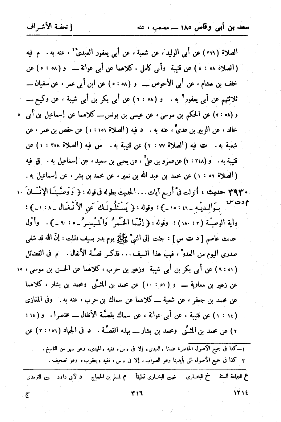 ت في التفسير (9 الأنفال: 1) عن أبي كريب , عن أبي بكر بن عيَّاش - بهذه القصَّة , وقال: حسن صحيح. [و (30 العنكبوت: 1) عن محمد بن المثنَّى ومحمد بن بشار - ببعضه - أنزلت فيَّ أربع آيات ... فذكر قصَّةً. وقالت أمُّ سعد: أليس قد أمر الله بالبرِّ ... الحديث بهذه القصَّة , وقال: حسن صحيح] .