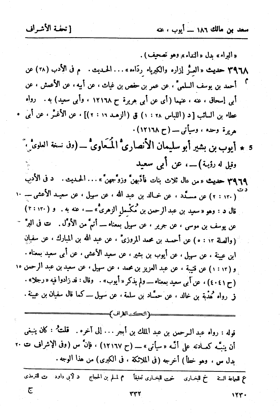ت في البرِّ (والصلة 13: 5) عن أحمد بن محمد المروزيِّ , عن عبد الله بن المبارك , عن سفيان بن عيينة , عن سهيل , عن أيوب بن بشير , عن سعيد الأعشي , عن أبي سعيد بمعناه. و (13: 1) عن قتيبة , عن عبد العزيز بن محمد , عن سهيل , عن سعيد بن عبد الرحمن (ح 4041) , عن أبي سعيد بمعناه - ولم يذكر أيوب. وقال: قد زادوا فيه رجلاً. (ز) رواه هُدْبة بن خالد , عن حمَّاد بن سلمة , عن سهيل - كما قال سفيان بن عيينة. -[333]- ورواه يعقوب بن حميد بن كاسب , عن عبد العزيز بن محمد , عن سهيل - كما قال خالد وجرير؛ وكذلك رواه محمد بن الصبَّاح الدولابيُّ , عن إسماعيل بن زكريا , عن سهيل.