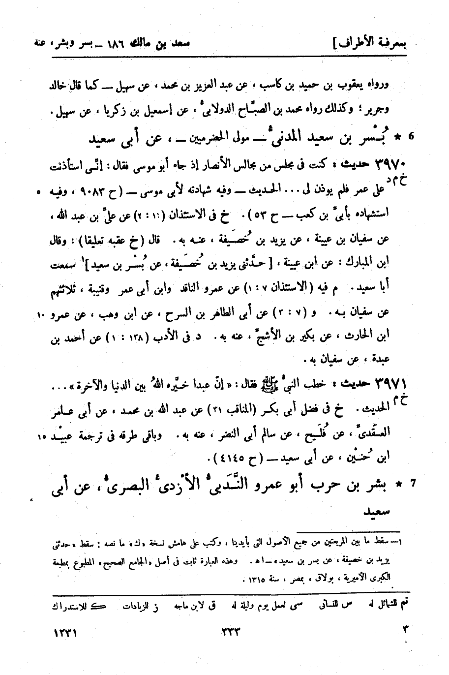 3970 -[خ م د] حديث: كنت في مجلس من مجالس الأنصار إذ جاء أبو موسى فقال: إنِّي استأذنت على عمر فلم يؤذن لي ... الحديث - وفيه شهادته لأبي موسى - (ح 9083، وفيه استشهاده بأبيِّ بن كعب - ح 53) .