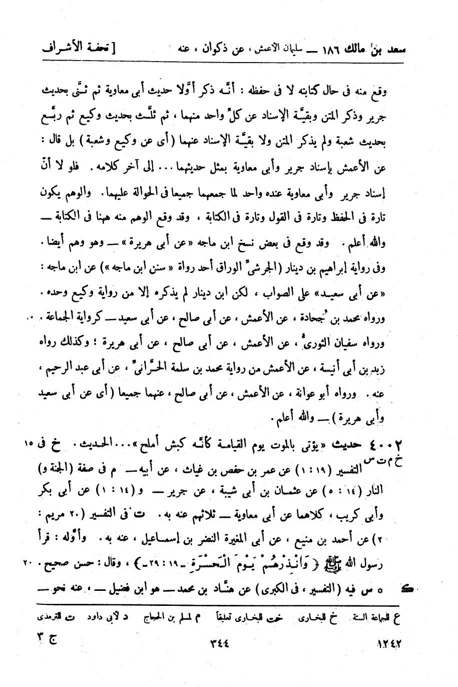ت في التفسير (20 مريم: 2) عن أحمد بن منيع , عن أبي المغيرة النضر بن إسماعيل , عنه به. وأوَّله: قرأ رسول الله صَلَّى اللَّهُ عَلَيْهِ وَسَلَّمَ وأنذرهم يَوْمَ الْحَسْرَةِ (19: 29) , وقال: حسن صحيح. (ك س) فيه (التفسير , في الكبرى) عن هنَّاد بن محمد - هو ابن فضيل - , عنه نحو -[345]- وأوله: إذا دخل أهل النار النارَ وأهل الجنَّة الجنَّة. رُوي عن الأعمش , عن صالح , عن أبي هريرة , وسيأتي - (ح 12308) . (ك) حديث هنَّاد ليس في الرواية ولم يذكره أبو القاسم.