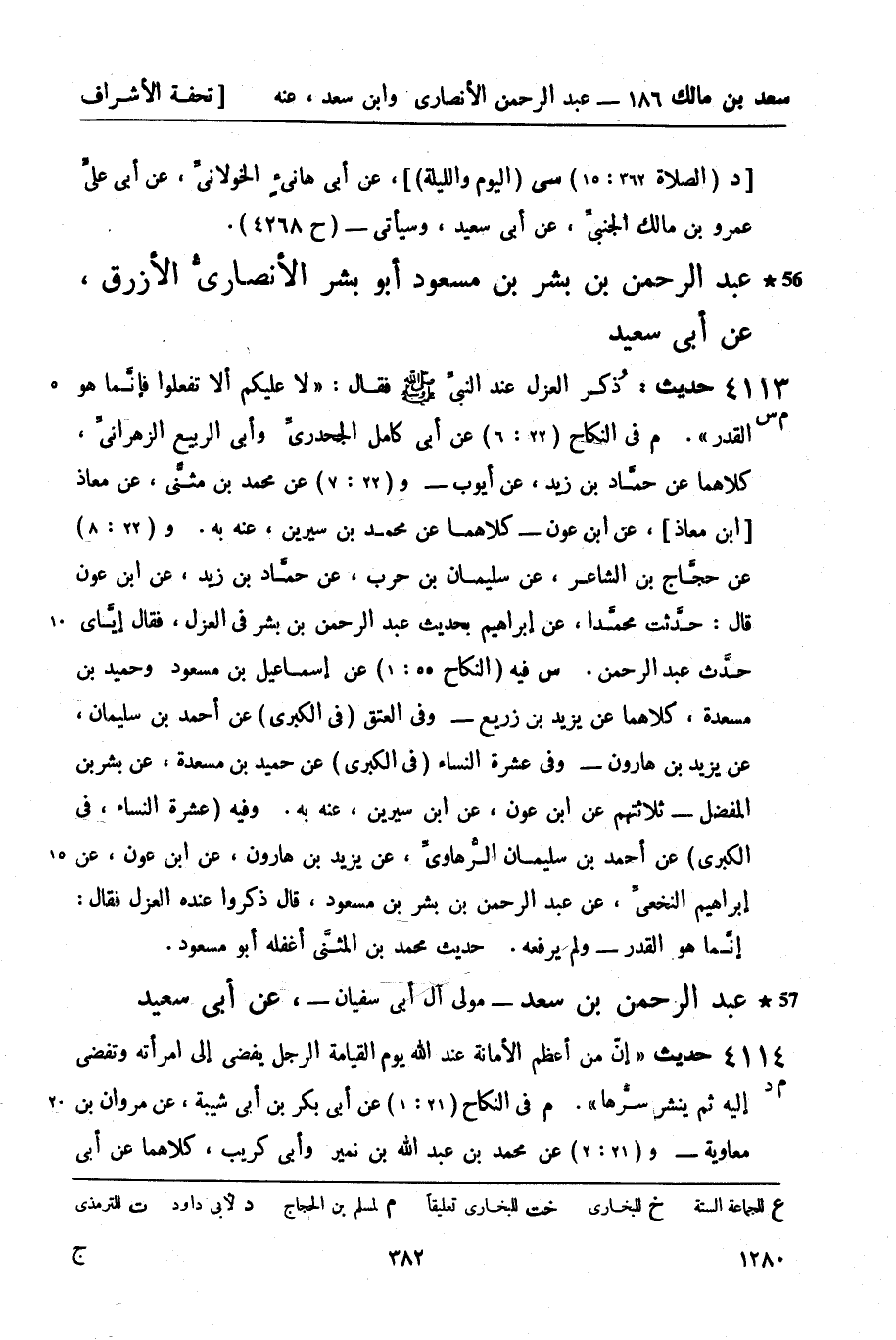 س فيه (النكاح 55: 1) عن إسماعيل بن مسعود وحميد بن مسعدة، كلاهما عن يزيد بن زريع - وفي العتق (في الكبرى) عن أحمد بن سليمان , عن يزيد بن هارون - وفي عشرة النساء (في الكبرى) عن حميد بن مسعدة، عن بشر بن المفضل - ثلاثتهم عن ابن عون، عن ابن سيرين، عنه به. وفيه (عشرة النساء في الكبرى) عن أحمد بن سليمان الرُّهاويِّ، عن يزيد بن هارون، عن ابن عون، عن إبراهيم النخعيِّ، عن عبد الرحمن بن بشر بن مسعود، قال ذكروا عنده العزل فقال: إنَّما هو القدر - ولم يرفعه. حديث محمد بن المثنَّى أغفله أبو مسعود.