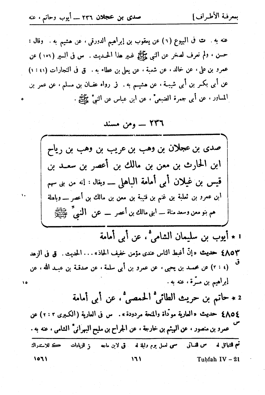 ومن مسند صدى بن عجلان بن وهب بن عريب بن وهب بن رياح بن الحارث بن معن بن مالك بن أعصر بن سعد بن قيس بن غيلان أبي أمامة الباهلي - ويُقال: إنه من بني سهم بن عمرو بن ثعلبة بن غنم بن قُتَيْبَة بن معن بن مالك بن أعصر - وباهلة هم بنو معن وسعد مناة - ابني مالك بن أعصر - عن النَّبِيّ صَلَّى اللَّهُ عَلَيْهِ وَسَلَّمَ