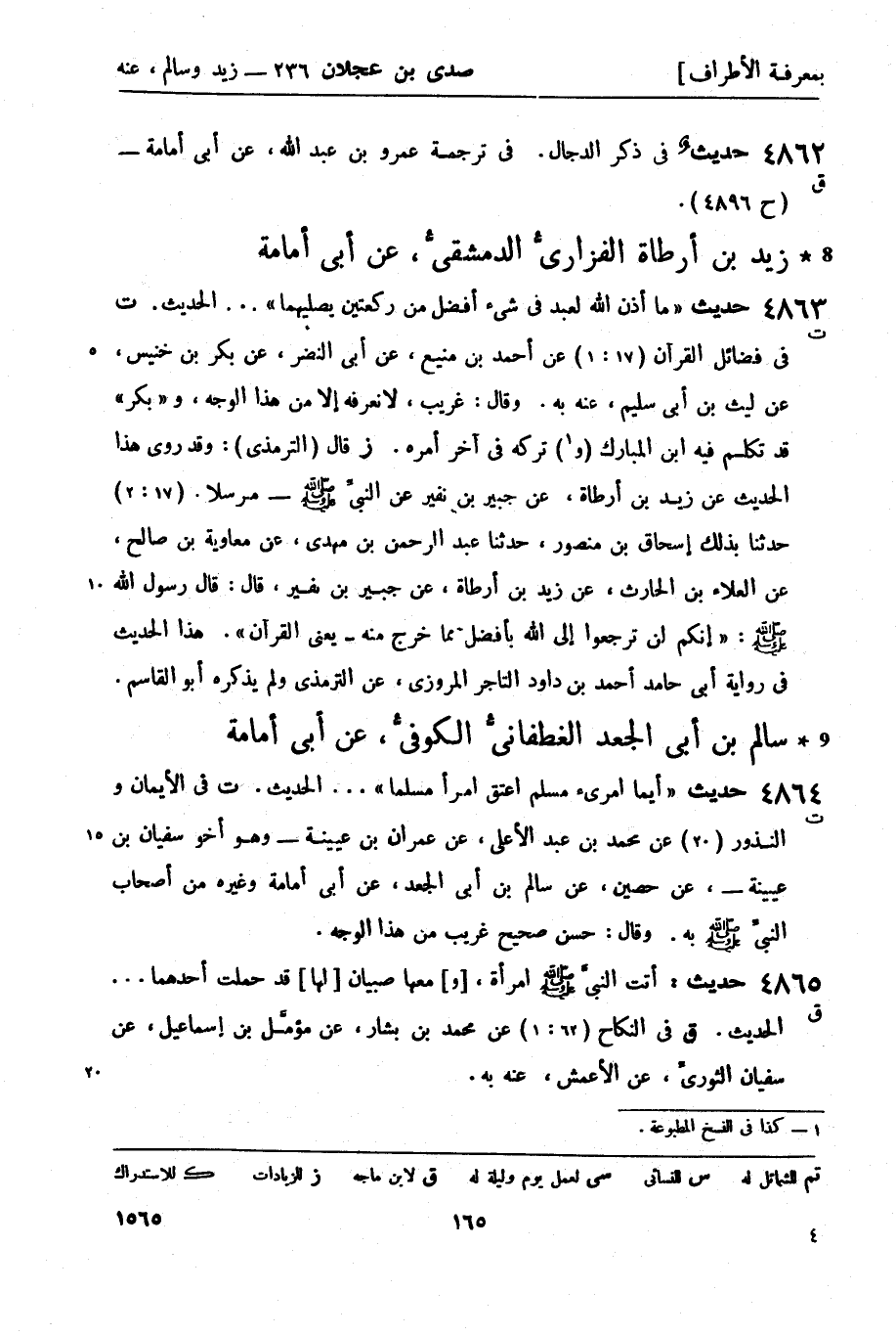 4864 -[ت] حديث أيما امرئ مسلم أعتق امرأ مسلمًا ... الحديثَ. ت في الأيمان والنذور (20) عن محمد بن عبد الأعلى، عن عمران بن عُيَيْنَة - وهو أخو سفيان بن عُيَيْنَة -، عن حصين، عن سالم بن أبي الجعد، عن أبي أمامة وغيره من أصحاب النبيِّ صَلَّى اللَّهُ عَلَيْهِ وَسَلَّمَ بِهِ. وقال: حسن صحيح غريب من هذا الوجه.