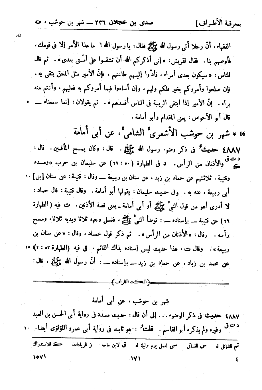 4887 -[د ت ق] حديثٌ في ذكر وضوء رسول الله صَلَّى اللَّهُ عَلَيْهِ وَسَلَّمَ، قال: وكان يمسح المأقين. قال: والأذنان من الرأس. د في الطهارة (50: 29) عن سليمان بن حرب ك ومسدد وقُتَيْبَة، ثلاثتهم عن حماد بن زيد، عن سنان بن ربيعة - وقال: قُتَيْبَة: عن سنان [بن] أبي ربيعة، عنه بِهِ. وفي حديث سليمان: يقولها أبو أمامة. وقال قُتَيْبَة: قال حماد: لا أدري أهو من قول النبيِّ صَلَّى اللَّهُ عَلَيْهِ وَسَلَّمَ أو أبي أمامة - يعني قصة الأذنين. ت فيه (الطهارة 29) عن قُتَيْبَة - بإسناده -: توضأ النبيّ صَلَّى اللَّهُ عَلَيْهِ وَسَلَّمَ، فغسل وجهه ثلاثًا ويديه ثلاثًا، ومسح رأسه. وقال: الأذنان من الرأس. ثم ذكر قول حماد، وقال: عن سنان بن ربيعة. وقال ت: هذا حديث ليس إسناده بذاك القائم، ق فيه (الطهارة 5: 2) عن محمد بن زياد، عن حماد بن زياد - بإسناده -: أنّ رسول الله صَلَّى اللَّهُ عَلَيْهِ وَسَلَّمَ، قال: -[172]- الأذنان من الرأس وكان يمسح رأسه مرة، وكان يمسح المأقين. ك حديث مسدد في رواية أبي الحسن بن العبد وغير ولم يذكره أبو القاسم.
