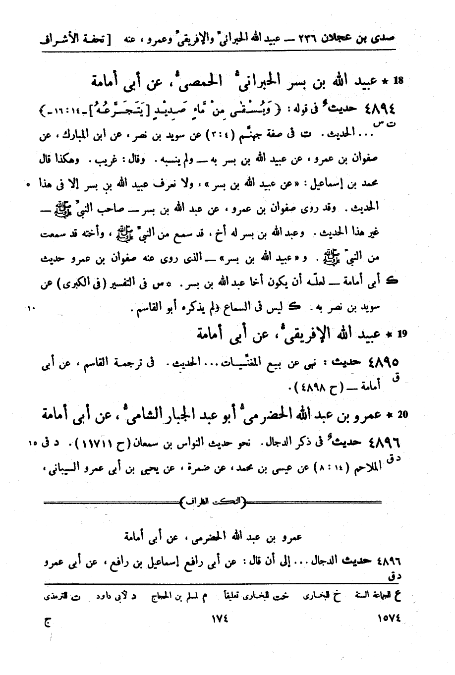 4894 -[ت س] حديثٌ في قوله: وَيُسْقى مِنْ مَّاءٍ صَدِيْدٍ [يَتَجَرَّعُهُ] (- 14: 16 -) ... الحديثَ. ت في صفة جهنَّم (4: 3) عن سويد بن نصر، عن ابن المبارك، عن صفوان بن عمرو، عن عُبَيد الله بن بسر بِهِ - ولم ينسبه، وقال: غريب. وهكذا قال محمد بن إسماعيل: عن عُبَيد الله بن بسر، ولا نعرف عُبَيد الله بن بسر إلا في هذا الحديث. وقد روى صفوان بن عمرو، عن عبد الله بن بسر - صاحب النبيِّ صَلَّى اللَّهُ عَلَيْهِ وَسَلَّمَ - غير هذا الحديث. وعبد الله بن بسر له أخ، قد سمع من النبيّ صَلَّى اللَّهُ عَلَيْهِ وَسَلَّمَ، وأخته قد سمعت من النبيّ صَلَّى اللَّهُ عَلَيْهِ وَسَلَّمَ. وعُبَيد الله بن بسر - الذي روى عنه صفوان بن عمرو حديث أبي أمامة - لعلّه أن يكون أخا عبد الله بن بسر. ك س في التفسير (في الكبرى) عن سويد بن نصر بِهِ. ك ليس في السماع ولم يذكره أبو القاسم.