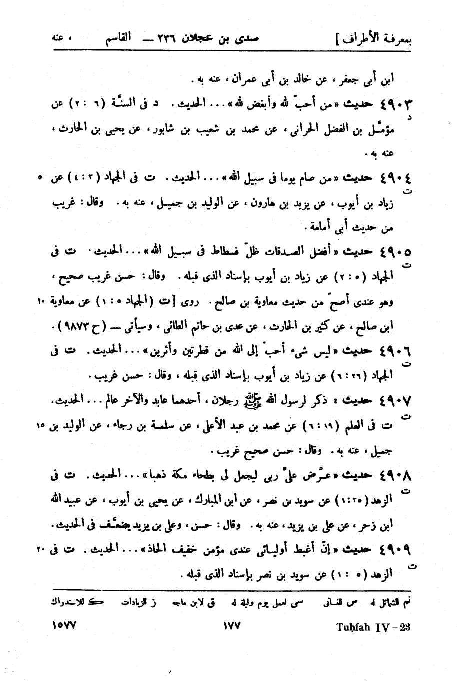 4909 -[ت] حديث إنّ أغبط أوليائي عندي مؤمن خفيف الحاذ.... الحديثَ. ت في الزهد (5: 1) عن سويد بن نصر بإسناد الذي قبله.