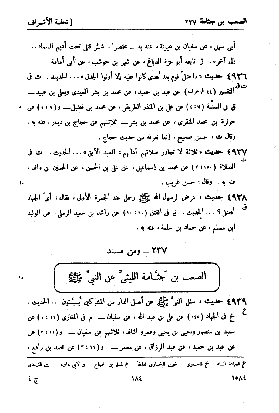 4936 -[ت ق] حديث ما ضلّ قوم بعد هُدى كانوا عليه إلا أوتوا الجدل ... الحديثَ. ت في التفسير (44 الزخرف) عن عبد بن حميد، عن محمد بن بشر العبدي ويعلى بن عُبَيد - ق في السنَّة (7: 4) عن علي بن المنذر الطريقي، عن محمد بن فضيل - و (7: 4) عن حوثرة بن محمد المنقري، عن محمد بن بشر - ثلاثتهم عن حجاج بن دينار، عنه به. وقال ت: حَسَنٌ صحيح، إنما نعرفه من حديث حجاج.