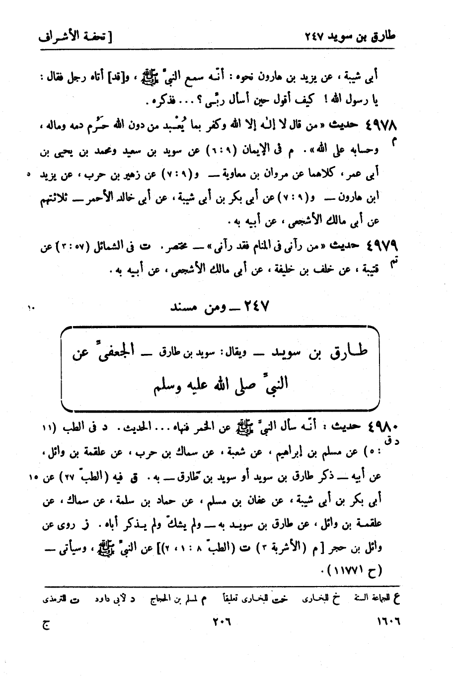 ومن مسند طارق بن سويد - ويُقال: سويد بن طارق - الجعفيِّ عن النَّبِيّ صَلَّى اللَّهُ عَلَيْهِ وَسَلَّمَ