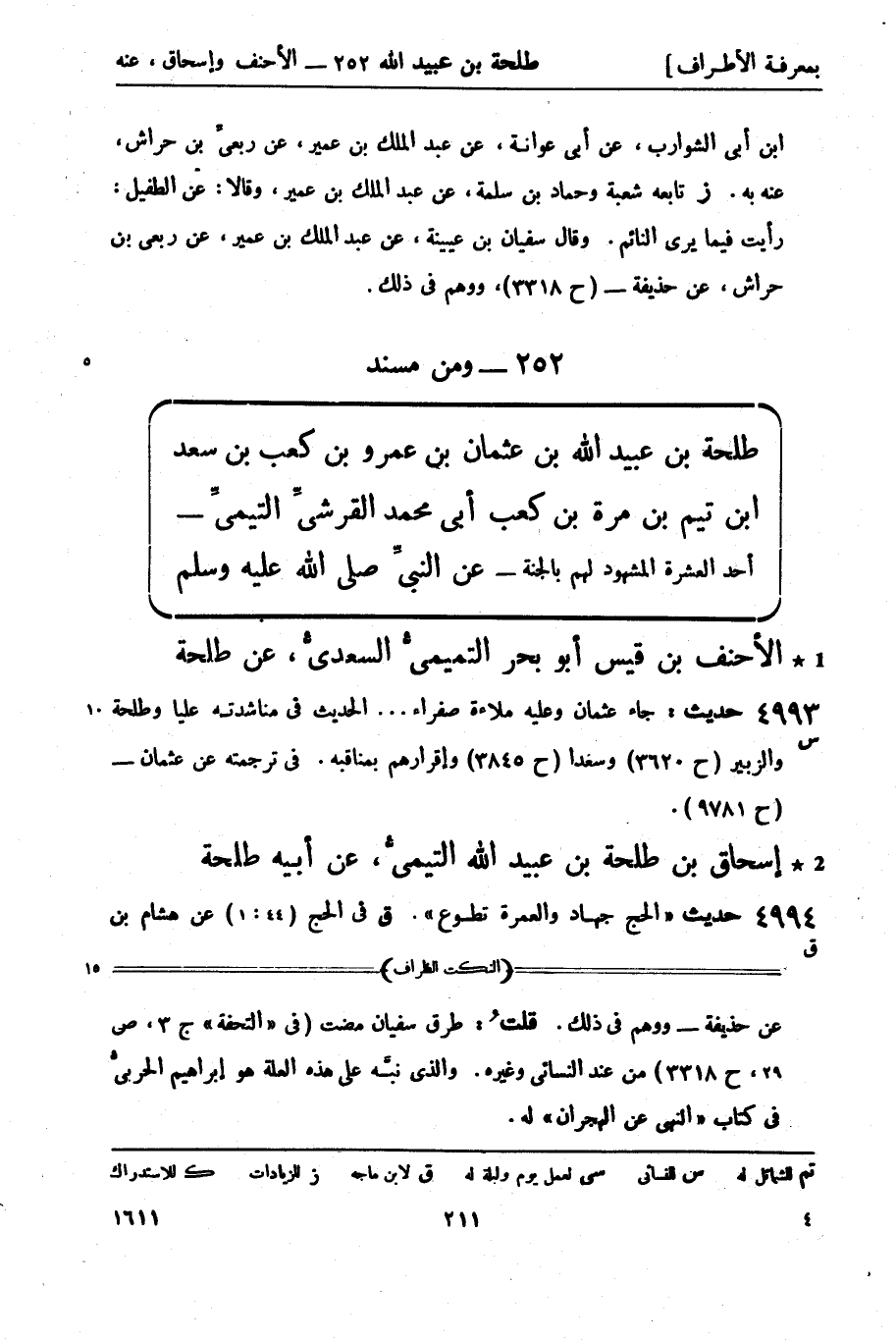 ومن مسند طلحة بن عُبَيد الله بن عثمان بن عمرو بن كعب بن سعد بن تيم بن مرة بن كعب أبي محمد القرشيِّ التيميِّ - أحد العشرة المشهود لهم بالجنة - عن النَّبِيّ صَلَّى اللَّهُ عَلَيْهِ وَسَلَّمَ
