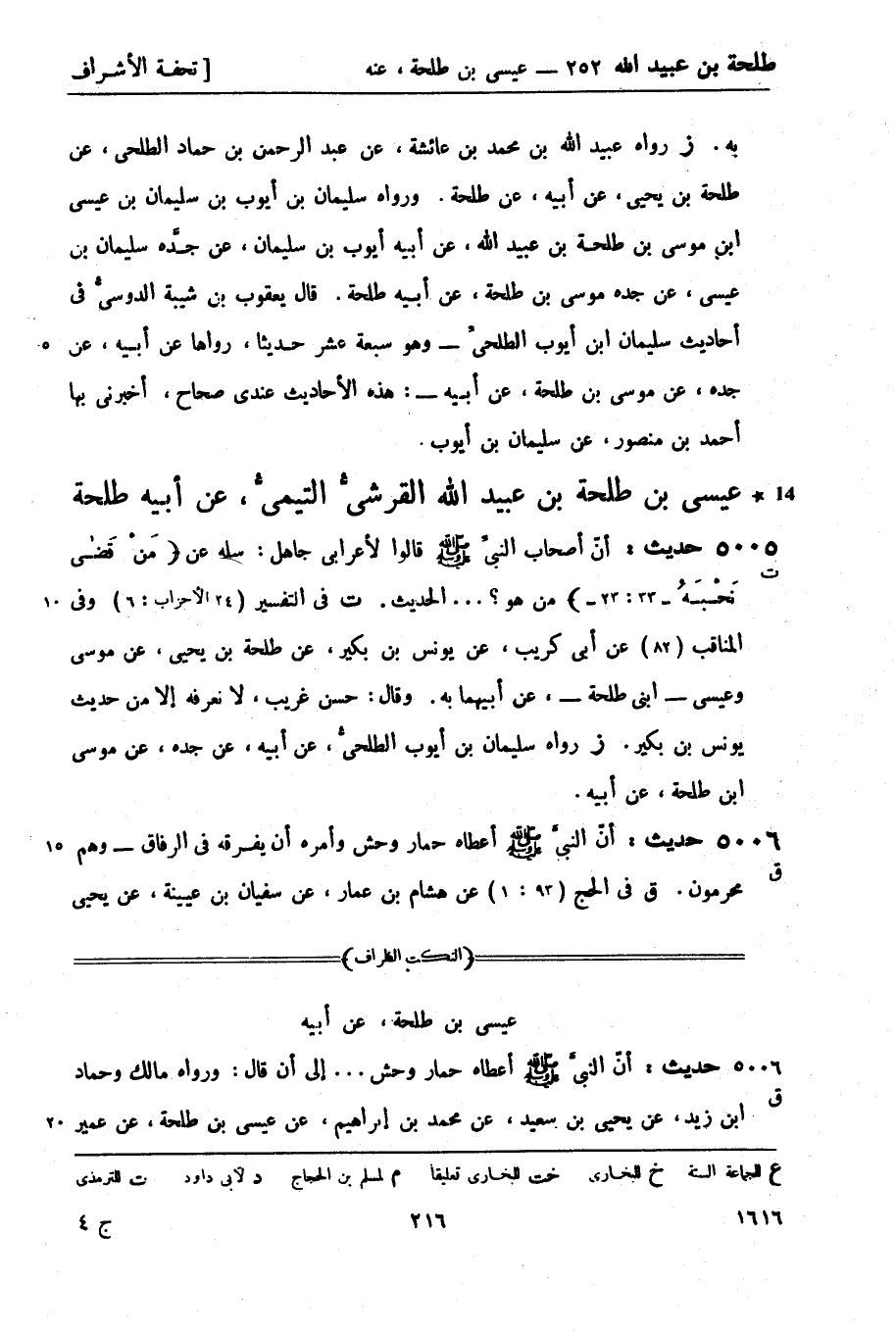 5005 -[ت] حديث: إن أصحاب النبيِّ صَلَّى اللَّهُ عَلَيْهِ وَسَلَّمَ قالوا لأعرابي جاهل: سله عن مَنْ قَضى نحبه (- 33: 23 -) من هو؟ ... الحديثَ. ت في التفسير (34 الأحزاب: 6) وفي المناقب (82) عن أبي كريب، عن يونس بن بكير، عن طلحة بن يحيى، عن موسى وعيسى - ابني طلحة -، عن أبيهما بِهِ. وقال: حسن غريب، لا نعرفه إلا من حديث يونس بن بكير. ز رواه سليمان بن أيوب الطلحيُّ، عن أبيه، عن جده، عن موسى بن طلحة، عن أبيه.