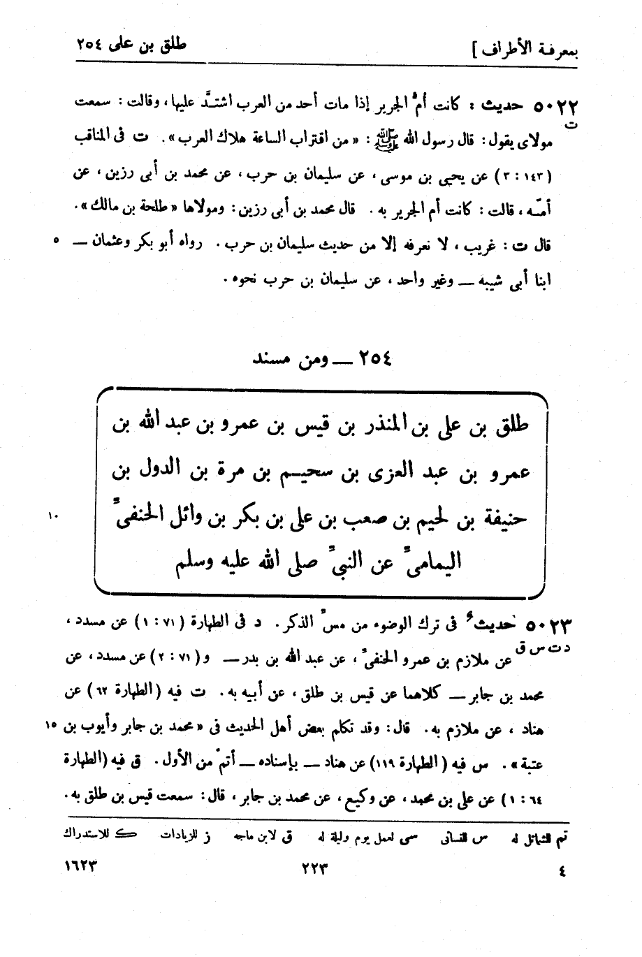 5023 -[د ت س ق] حديثٌ في ترك الوضوء من مسِّ الذكر. د في الطهارة (71: 1) عن مسدد، عن ملازم بن عمرو الحنفيِّ، عن عبد الله بن بدر - و (71: 2) عن مسدد، عن محمد بن جابر - كلاهما عن قيس بن طلق، عن أبيه بِهِ. ت فيه (الطهارة 62) عن هناد، عن ملازم بِهِ. قال: وقد تكلم بعض أهل الحديث في محمد بن جابر وأيوب بن عتبة. س فيه (الطهارة 119) عن هناد - بإسناده - أتم من الأول. ق فيه (الطهارة 64: 1) عن علي بن محمد، عن وكيع، عن محمد بن جابر، قال: سمعت قيس بن طلق بِهِ.
