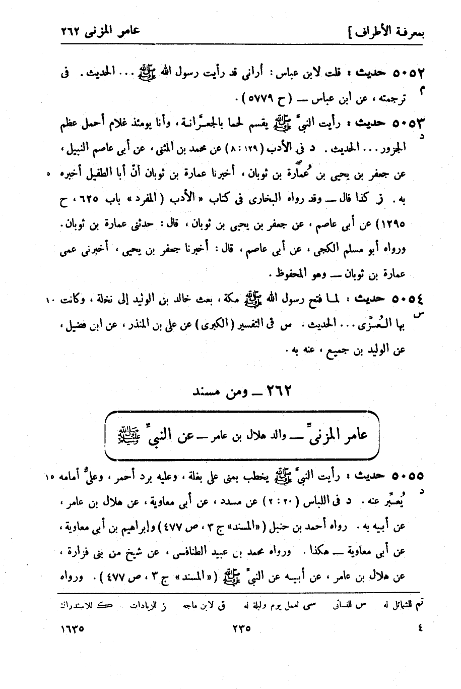 5055 -[د] حديث: رأيت النبيَّ صَلَّى اللَّهُ عَلَيْهِ وَسَلَّمَ يخطب بمنى على بغلة، وعليه برد أحمر، وعليٌّ أمامه يُعبِّر عنه. د في اللباس (20: 2) عن مسدد، عن أبي معاوية، عن هلال بن عامر، عن أبيه بِهِ. رواه أحمد بن حنبل (المسند ج 3، ص 477) وإبراهيم بن أبي معاوية، عن أبي معاوية - هكذا. ورَواهُ محمد بن عُبَيد الطنافسي، عن شيخ من بني فزارة، عن هلال بن عامر، عن أبيه عن النبيِّ صَلَّى اللَّهُ عَلَيْهِ وَسَلَّمَ (المسند ج 3، ص 477) . ورَواهُ -[236]- مروان بن معاوية الفزاري، عن هلال بن عامر، عن رافع بن عمرو المزني، وقد مضى - (ح 3597) . والأول هو الصواب.