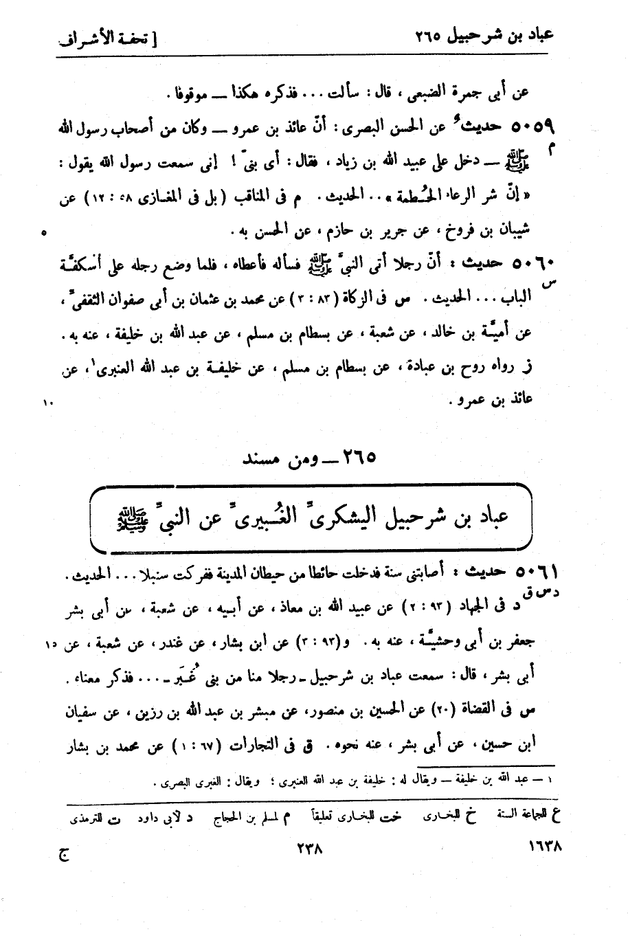 5060 -[س] حديث: أنّ رجلاً أتى النبيَّ صَلَّى اللَّهُ عَلَيْهِ وَسَلَّمَ فسأله فأعطاه، فلما وضع رجله على أسْكفَّة الباب ... الحديثَ. س في الزكاة (83: 3) عن محمد بن عثمان بن أبي صفوان الثقفيِّ، عن أميَّة بن خالد، عن شعبة، بن بسطام بن مسلم، عن عبد الله بن خليفة، عنه به. ز رواه روح بن عبادة، عن بسطام بن مسلم، عن خليفة بن عبد الله العنبري4، عن عائذ بن عمرو.