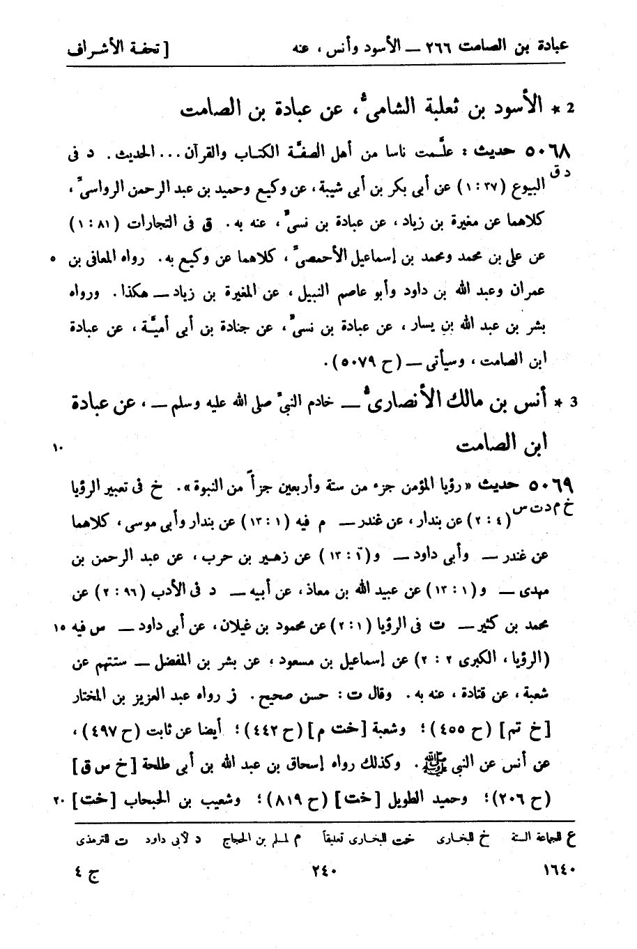 5069 -[خ م د ت س] حديث رؤيا المؤمن جزء من ستة وأربعين جزأ من النبوة. خ في تعبير الرؤيا (4: 2) عن بُنْدَار، عن غندر - م فيه (1: 13) عن بُنْدَار وأبي موسى، كلاهما عن غندر - وأبي داود - و (1: 13) عن زهير بن حرب، عن عبد الرحمن بن مهدي - و (1: 13) عن عُبَيد الله بن معاذ، عن أبيه - د في الأدب (96: 2) عن محمد بن كثير - ت في الرؤيا (1: 2) عن محمود بن غيلان، عن أبي داود - س فيه (الرؤيا، الكبرى 2: 2) عن إسماعيل بن مسعود، عن بشر بن المفضل - ستتهم عن شعبة، عن قتادة، عنه به. وقال ت: حَسَنٌ صحيح. ز رواه عبد العزيز بن المختار [خ تم] (ح 455) ؛ وشعبة [خت م] (ح 442) ؛ أيضًا عن ثابت (ح 497) ، عن أنس عن النبيّ صَلَّى اللَّهُ عَلَيْهِ وَسَلَّمَ. وكذلك رواه إسحاق بن عبد الله بن أبي طلحة [خ س ق] (ح 206) ؛ وحميد الطويل [خت] (ح 819) ؛ وشعيب بن الحبحاب [خت -[241]-] (ح 917) ؛ عن أنس عن النبيّ صَلَّى اللَّهُ عَلَيْهِ وَسَلَّمَ - وقد مضى.