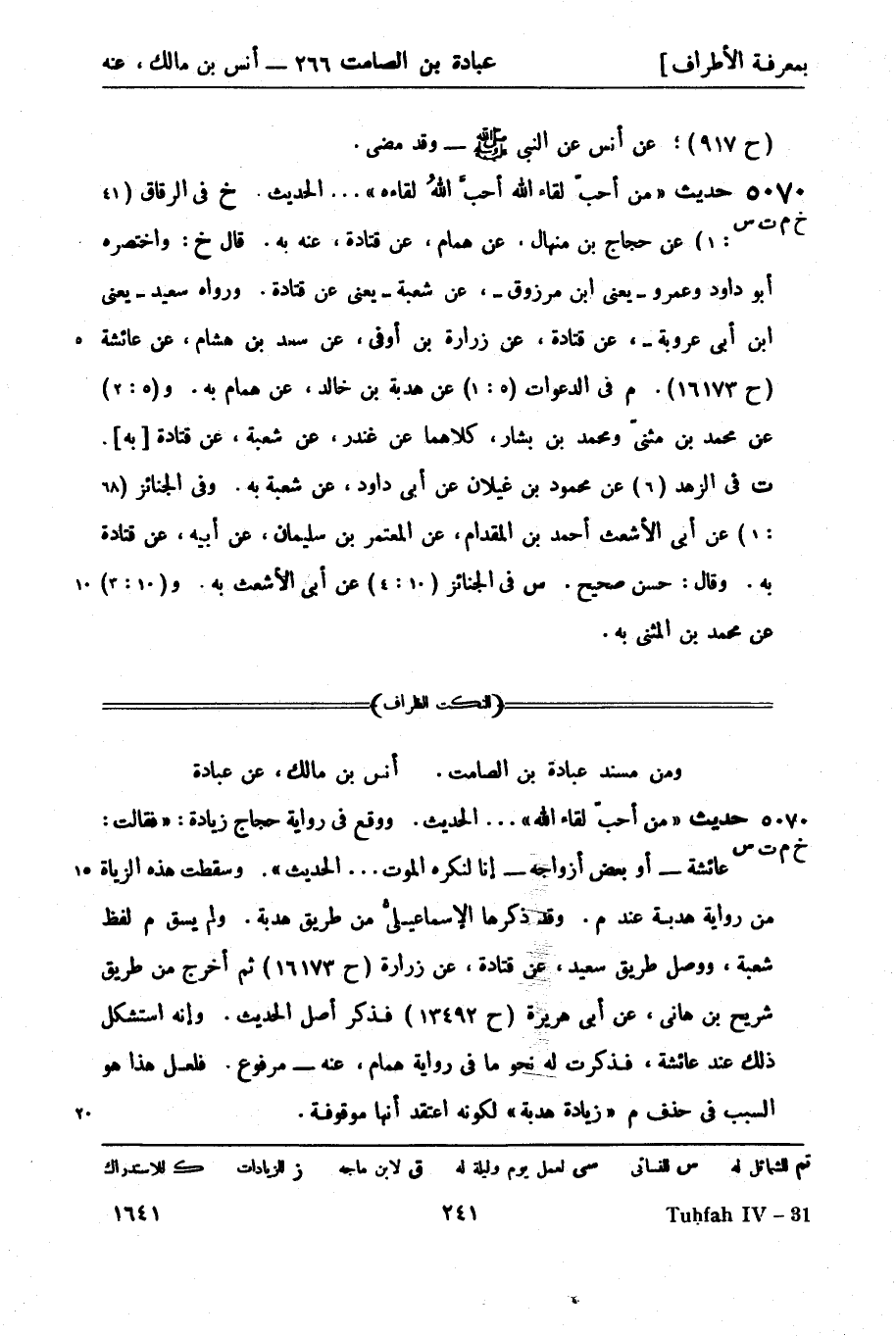 5070 -[خ م ت س] حديث من أحبّ لقاء الله أحبَّ اللهُ لقاءه ... الحديث. خ في الرقاق (41: 1) عن حجاج بن منهال، عن همام، عن قتادة، عنه بِهِ. قال خ: واختصره أبو داود وعمرو - يعني ابن مرزوق -، عن شعبة - يعني عن قتادة. ورَواهُ سعيد - يعني ابن أبي عروبة -، عن قتادة، عن زرارة بن أوفى، عن سعد بن هشام، عن عائشة (ح 16173) . م في الدعوات (5: 1) عن هدبة بن خالد، عن همام بِهِ. و (5: 2) عن محمد بن مثنّى ومحمد بن بشار، كلاهما عن غندر، عن شعبة، عن قتادة [به] . ت في الزهد (6) عن محمود بن غيلان عن أبي داود، عن شعبة بِهِ. وفي الجنائز (68: 1) عن أبي الأشعث أحمد بن المقدام، عن المعتمر بن سليمان، عن أبيه، عن قتادة بِهِ. وقال: حسن صحيح. س في الجنائز (10: 4) عن أبي الأ ... بِهِ. و (10: 3) عن محمد بن المثنى بِهِ.