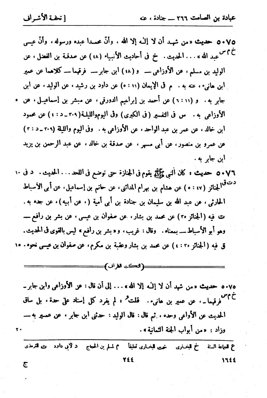 5075 -[خ م س] حديث من شهد أن لا إله إلا الله، وأنّ محمدًا عبده ورسوله، وأنّ عيسى عبد الله ... الحديث. خ في أحاديث الأنبياء (48) عن صدقة بن الفضل، عن الوليد بن مسلم، عن الأوزاعي - و (48) ابن جابر - فرقهما - كلاهما عن عمير بن هانئ، عنه بِهِ. م في الإيمان (11: 5) عن داود بن رشيد، عن الوليد، عن ابن جابر بِهِ. و (11: 6) عن أحمد بن إبراهيم الدورقي، عن مبشر بن إسماعيل، عن الأوزاعي بِهِ. س في التفسير (في الكبرى) وفي اليوم والليلة (309 - د: 4) عن محمود بن خالد، عن عمر بن عبد الواحد، عن الأوزاعي بِهِ. وفي اليوم والليلة (309 - د: 3) عن عمرو بن منصور، عن أبي مسهر، عن صدقة بن خالد، عن عبد الرحمن بن يزيد بن جابر به.