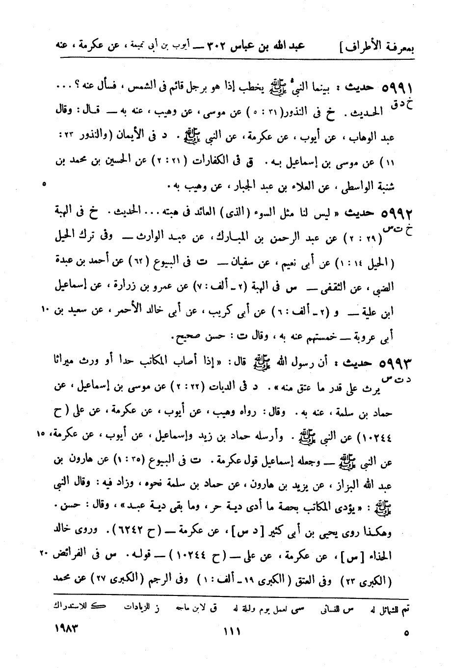 5993 -[د ت س] حديث: أن رسول الله صَلَّى اللَّهُ عَلَيْهِ وَسَلَّمَ قال: إذا أصاب المكاتب حداً أو ورث ميراثاً يرث على قدر ما عتق منه. (د) في الديات (22: 2) عن موسى بن إسماعيل، عن حماد بن سلمة، عنه به. وقال: رواه وهيب، عن أيوب، عن عكرمة، عن علي (ح 10244) عن النبيّ صَلَّى اللَّهُ عَلَيْهِ وَسَلَّمَ وأرسله حماد بن زيد وإسماعيل، عن أيوب، عن عكرمة، عن النبي صَلَّى اللَّهُ عَلَيْهِ وَسَلَّمَ - وجعله إسماعيل قول عكرمة.