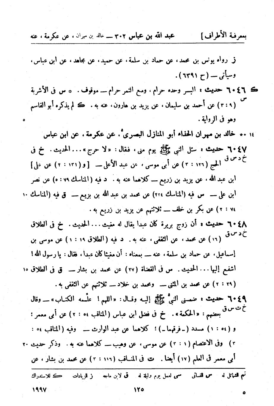 6049 -[خ ت س ق] حديث: ضمني النبيُّ صَلَّى اللَّهُ عَلَيْهِ وَسَلَّمَ إليه وقال: اللهم! علِّمه الكتاب - وقال بعضهم الحكمة (خ) في فضل ابن عباس (المناقب 54: 2) عن أبي معمر و (54: 1) مسدد (- قرقهما -) كلاهما عن عبد الوارث - وفيه (المناقب 54: 3) وفي الاعتصام (1: 3) عن موسى، عن وهيب - كلاهما عنه به. وذكر حديث أبي معمر في العلم (17) أيضاً.