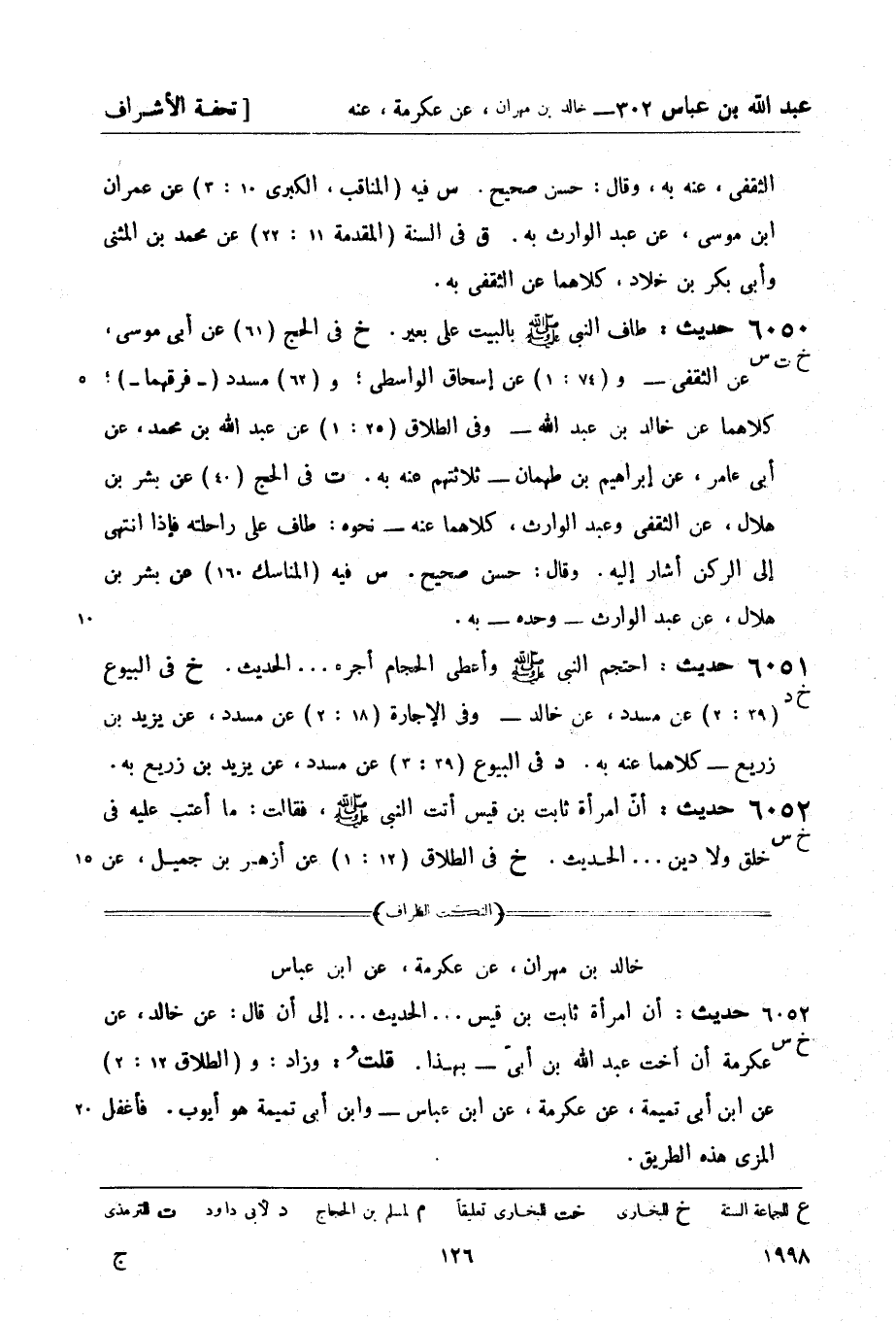 6050 -[خ ت س] حديث: طاف النبي صَلَّى اللَّهُ عَلَيْهِ وَسَلَّمَ بالبيت على بعير. (خ) في الحج (61) عن أبي موسى عن الثقفي - و (74: 1) عن إسحاق الواسطي، و (62) مسدد (- فرقهما -) كلاهما عن خالد بن عبد الله - وفي الطلاق (25: 1) عن عبد الله بن محمد، عن أبي عامر، عن إبراهيم بن طهمان - ثلاثتهم عنه به.