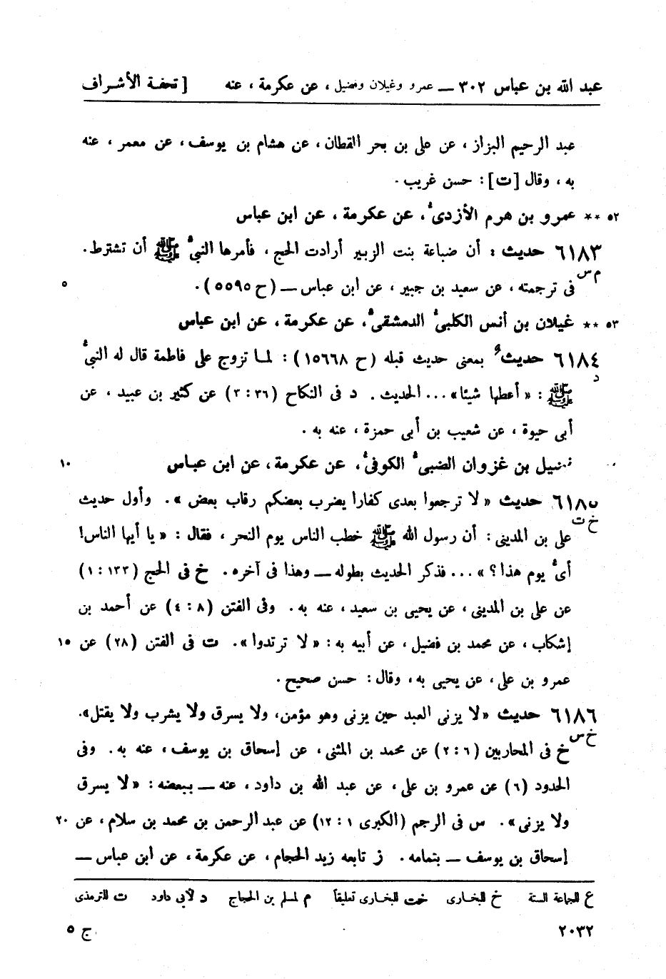 س في الرجم (الكبرى 1: 12) عن عبد الرحمن بن محمد بن سلام، عن إسحاق بن يوسف - بتمامه. (ز) تابعه زيد الحجام، عن عكرمة، عن ابن عباس -[161]- (ح 6092) ورواه عمارة بن أبي حفصة [س (الرجم الكبرى 1: 10) ] عن عكرمة، عن أبي هريرة - (ح 14248) - قوله. ورواه إسرائيل، عن جابر، عن عكرمة، عن ابن عباس، وابن عمر، وأبي هريرة - مرفوعاً.