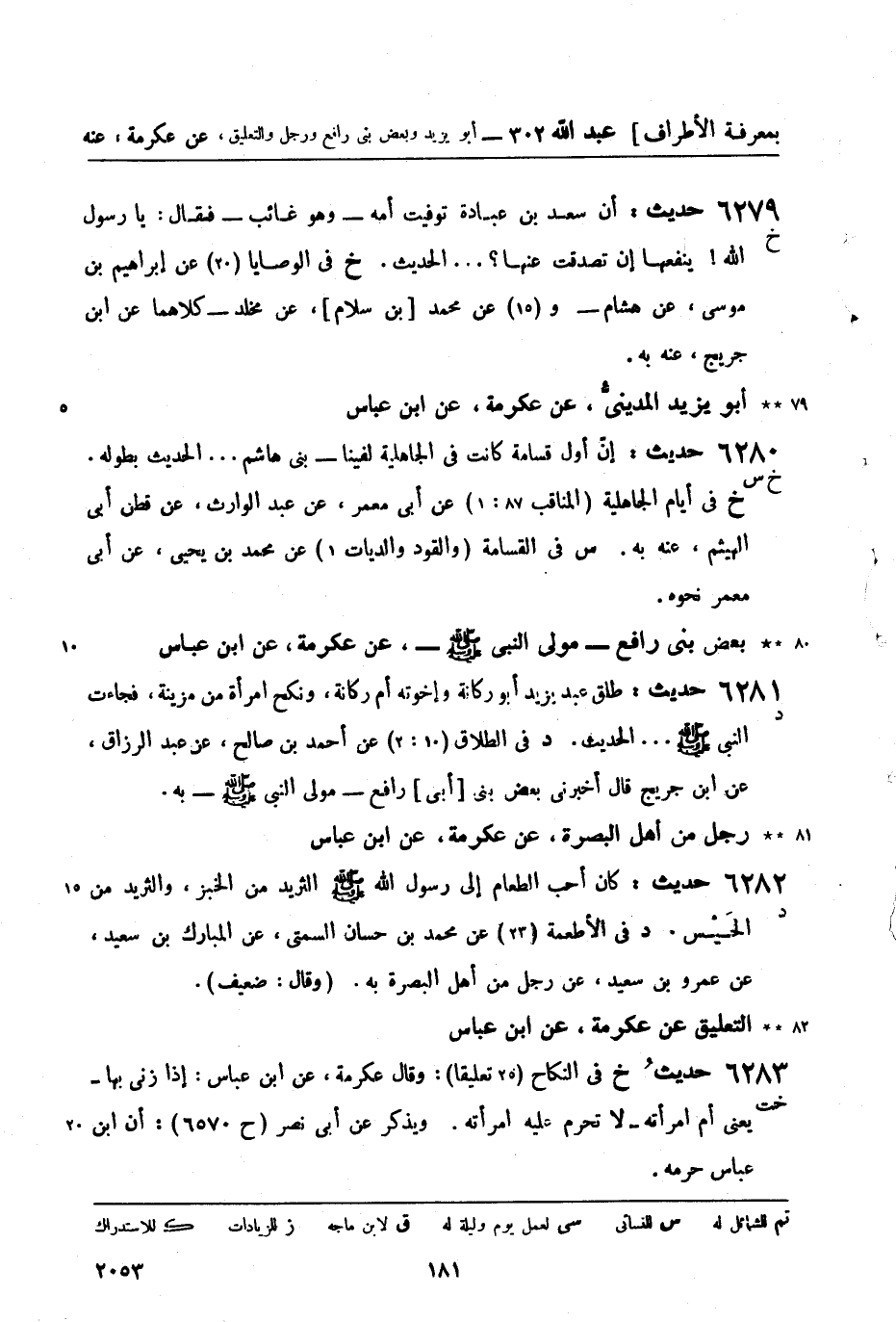 6283 -[خت] حديث (خ) في النكاح (25 تعليقاً) وقال عكرمة، عن ابن عباس: إذا زنى بها - يعني أم امرأته - لا تحرم عليه امرأته. ويذكر عن أبي نصر (ح 6570) : أن ابن عباس حرمه.
