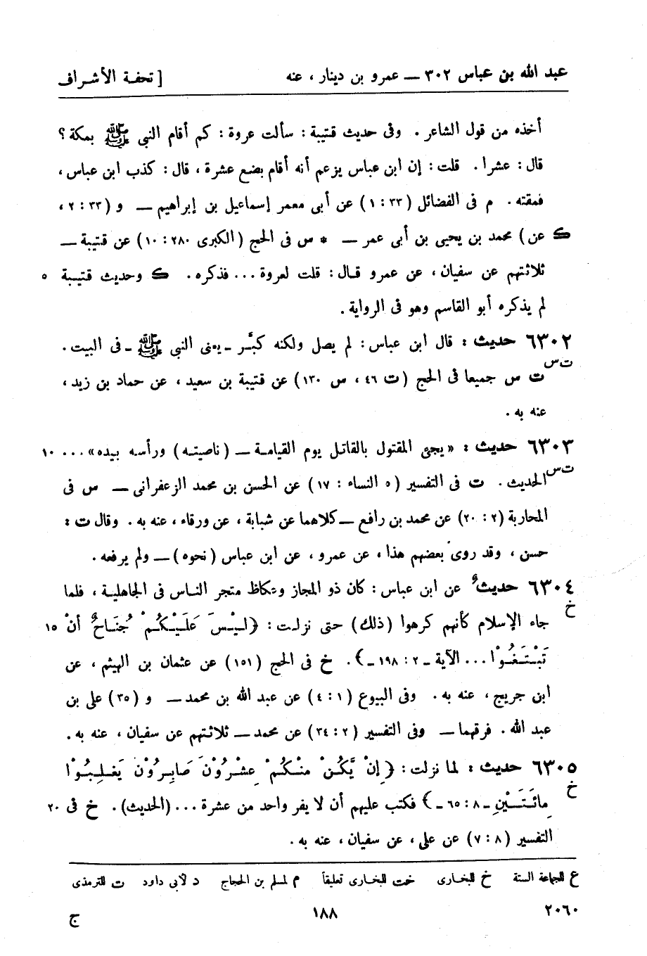 6302 -[ت س] حديث: قال ابن عباس: لم يصل ولكنه كبَّر - يعني النبي صَلَّى اللَّهُ عَلَيْهِ وَسَلَّمَ - في البيت. (ت س) جميعاً في الحج (ت 46، س 130) عن قتيبة بن سعيد، عن حماد بن زيد، عنه به.