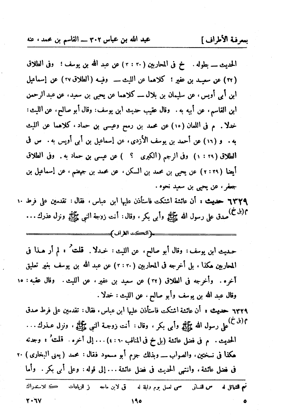 6329 - (م [بل خ] ) حديث: أن عائشة اشتكت فاستأذن عليها ابن عباس، فقال: تقدمين على فرط صدق على رسول الله صَلَّى اللَّهُ عَلَيْهِ وَسَلَّمَ وأبي بكر، وقال: أنت زوجة النبي صَلَّى اللَّهُ عَلَيْهِ وَسَلَّمَ ونزل عذرك ... -[196]- الحديث. (م) في فضل عائشة (بل خ في المناقب 60: 4) عن بندار، عن الثقفي، عن ابن عون، عنه به - مختصراً. وفي التفسير (24: 9: 2) عن ابن المثنى، عن الثقفي نحوه - يعني: أنت زوجة رسول الله صَلَّى اللَّهُ عَلَيْهِ وَسَلَّمَ ونزل عذرك.