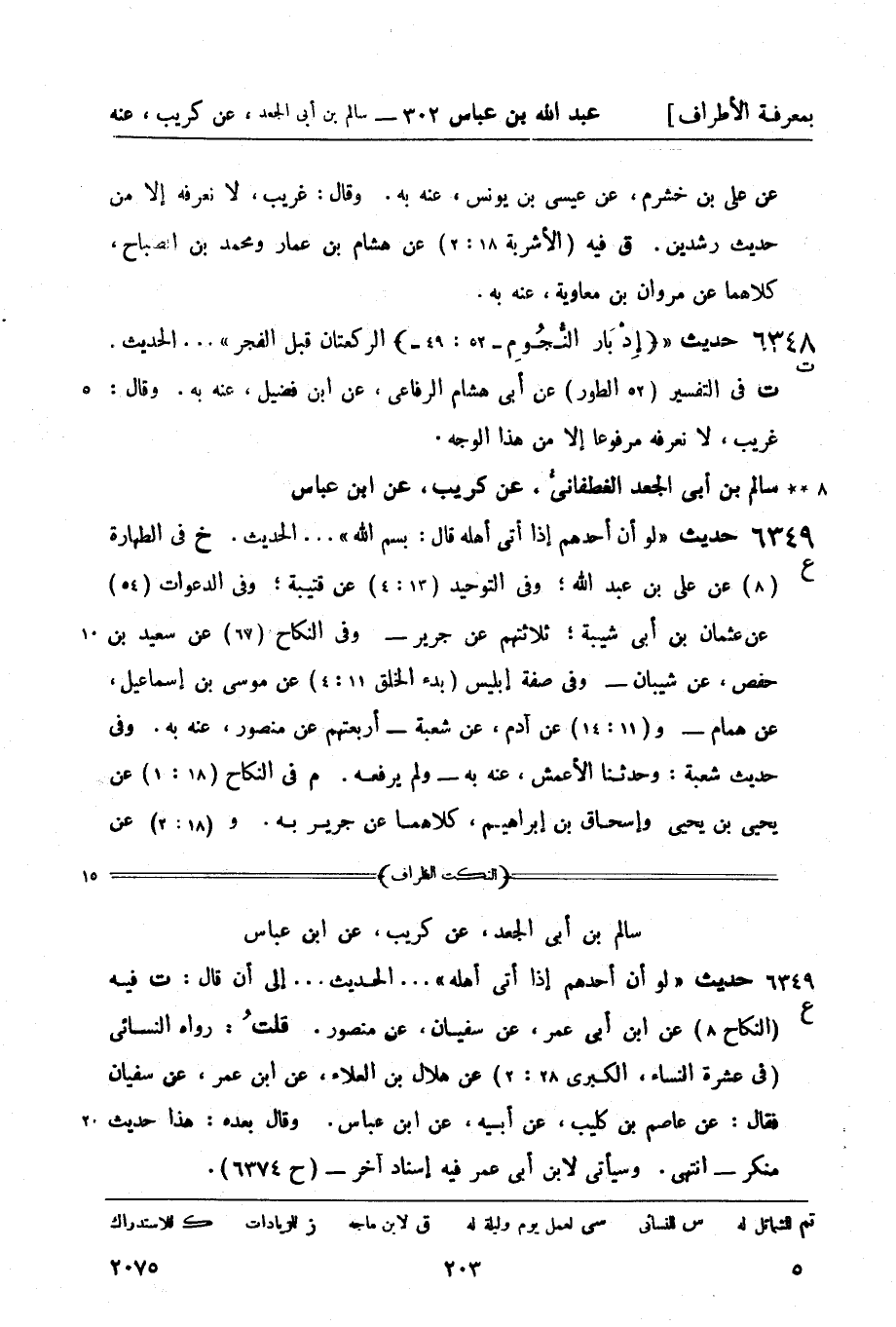 س في عشرة النساء (الكبرى 28: 1) عن محمد بن عبد الله بن يزيد بن المقرئ، عن سفيان بن عيينة به. وفي اليوم والليلة (98: 4) عن سليمان بن عبيد الله الغيلاني، عن بهز، عن شعبة بإسناد حديث آدم. و (98: 1) عن إسماعيل بن مسعود، عن عبد العزيز بن عبد الصمد، عن منصور - و (98: 5) الأعمش - فرقهما - كلاهما عنه به - مرفوعاً. و (98: 2) عن محمد بن عبد العزيز بن أبي رزمة، عن الفضل بن موسى، عن سفيان، عن منصور، عن كريب به - ولم يذكر سالماً و (98: 3) عن محمد بن حاتم بن نعيم، عن ابن أبي عمر، عن فضيل بن عياض، عن منصور، عن سالم، عن ابن عباس به - مرفوعاً - ولم يذكر كريبا