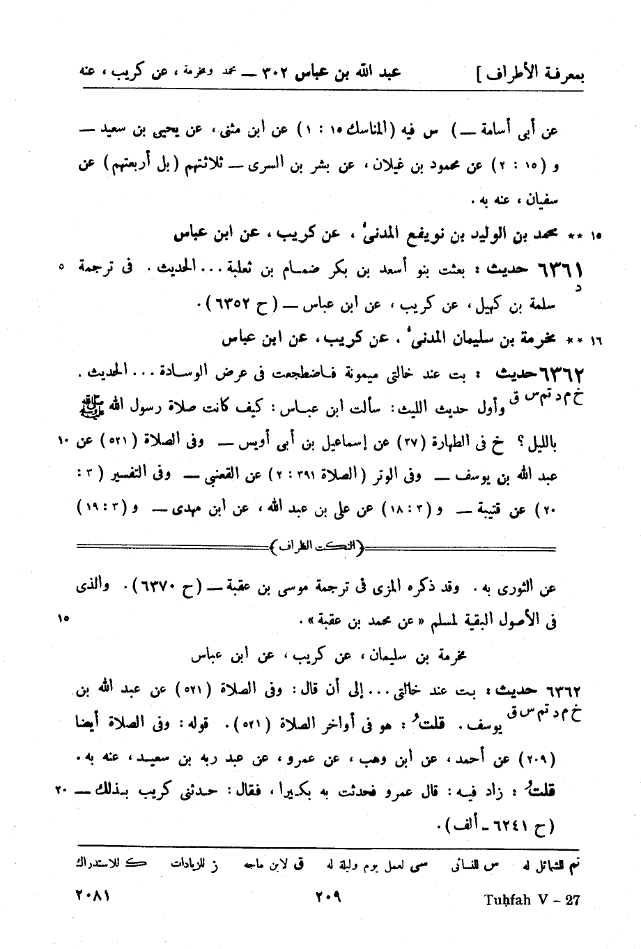 6362 -[خ م د تم س ق] بت عند خالتي ميمونة فاضطجعت في عرض الوسادة ... الحديث. وأول حديث الليث: سألت ابن عباس: كيف كانت صلاة رسول الله صَلَّى اللَّهُ عَلَيْهِ وَسَلَّمَ بالليل؟ (خ) في الطهارة (37) عن إسماعيل بن أبي أويس - وفي الصلاة (521) عن عبد الله بن يوسف - وفي الوتر (الصلاة 391: 2) عن القعنبي - وفي التفسير (3: 20) عن قتيبة - و (3: 18) عن علي بن عبد الله، عن ابن مهدي - و [210]- (3: 19) معن عن عيسى - فرقهما - ستتهم عن مالك، عنه به. وفي الصلاة أيضاً (209) عن أحمد، عن ابن وهب، عن عمرو، عن عبد ربه بن سعيد، عنه به.