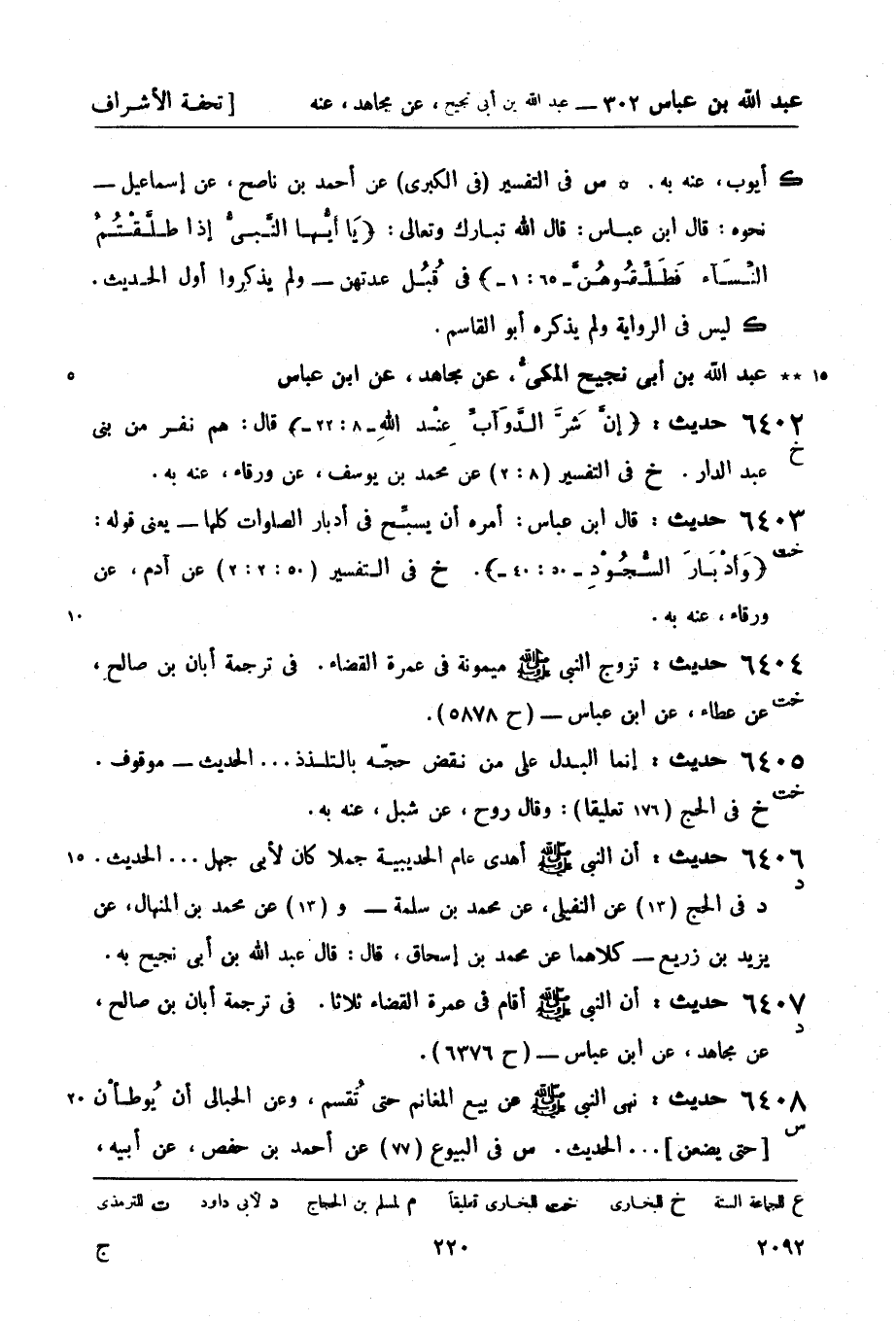 6403 -[خت] حديث: قال ابن عباس: أمره أن يسبِّح في أدبار الصلوات كلها - يعني قوله: وَأدْبَارَ السُّجُوْدِ (50: 40) (خ) في التفسير (50: 2: 2) عن آدم، عن ورقاء، عنه به.