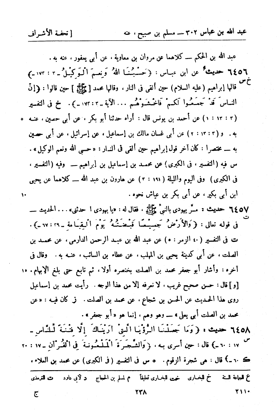6456 -[خ س] حديث عن ابن عباس حَسْبُنَا الله وَنِعمَ الْوَكِيلُ (3: 173) قالها إبراهيم (عليه السلام) حين ألقي في النار، وقالها محمد [صَلَّى اللَّهُ عَلَيْهِ وَسَلَّمَ] حين قالوا: إنّ الناسَ قَدْ جَمَعُوا لَكمْ فَاخْشَوْهُم ... الآية (3: 173) (خ) في التفسير (3: 13: 1) عن أحمد بن يونس قال: أُراه حدثنا أبو بكر، عن أبي حصين، عنه به و (3: 13: 2) عن أبي غسان مالك بن إسماعيل، عن إسرائيل، عن أبي حصين به - مختصراً كان آخر قول إبراهيم حين ألقي في النار حسبي الله ونعم الوكيل