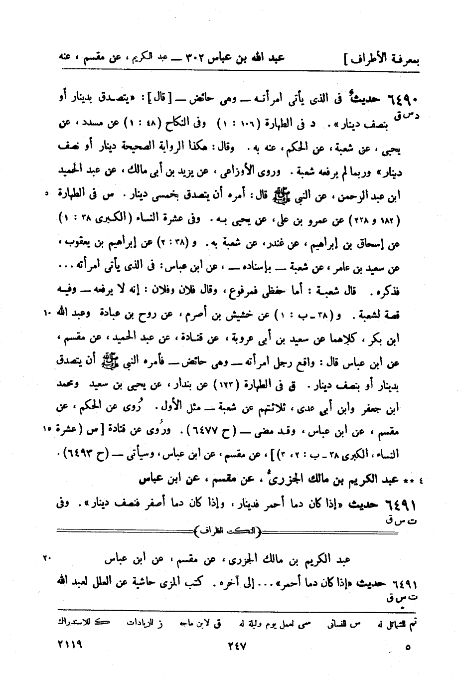 س في الطهارة (182 و228) عن عمرو بن علي، عن يحيى به. وفي عشرة النساء (الكبرى 38: 1) عن إسحاق بن إبراهيم، عن غندر، عن شعبة به. و (38: 2) عن إبراهيم بن يعقوب، عن سعيد بن عامر، عن شعبة - بإسناده - عن ابن عباس: في الذي يأتي امرأته ... فذكره. قال شعبة: أما حفظي فمرفوع، وقال فلان وفلان: إنه لا يرفعه - وفيه قصة لشعبة. و (38 - ب: 1) عن خشيش بن أصرم، عن روح بن عبادة، وعبد الله بن بكر، كلاهما عن سعيد بن أبي عروبة، عن قتادة، عن عبد الحميد، عن مقسم، عن ابن عباس قال: واقع رجل امرأته - وهي حائض - فأمره النبي صَلَّى اللَّهُ عَلَيْهِ وَسَلَّمَ أن يتصدق بدينار أو بنصف دينار.