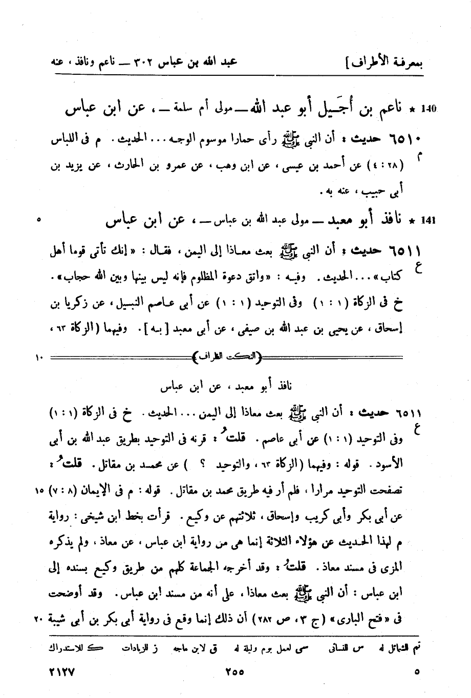 خ في الزكاة (1: 1) وفي التوحيد (1: 1) عن أبي عاصم النبيل، عن زكريا بن إسحاق، عن يحيى بن عبد الله بن صيفي، عن أبي معبد [به] وفيهما (الزكاة -[256]- 63، والتوحيد؟) عن محمد بن مقاتل - وفي المغازي (61: 5) عن حبان بن موسى - كلاهما عن ابن المبارك، عن زكريا به. وفي التوحيد أيضاً (1: 2) عن عبد الله بن أبي الأسود، عن الفضل بن العلاء - وفي الزكاة أيضاً (41) عن أمية بن بسطام، عن يزيد بن زريع، عن روح بن القاسم - كلاهما عن إسماعيل بن أمية، عن يحيى به، وفي المظالم (9) عن يحيى بن موسى، عن وكيع، عن زكريا - بذكر دعوة المظلوم حسب