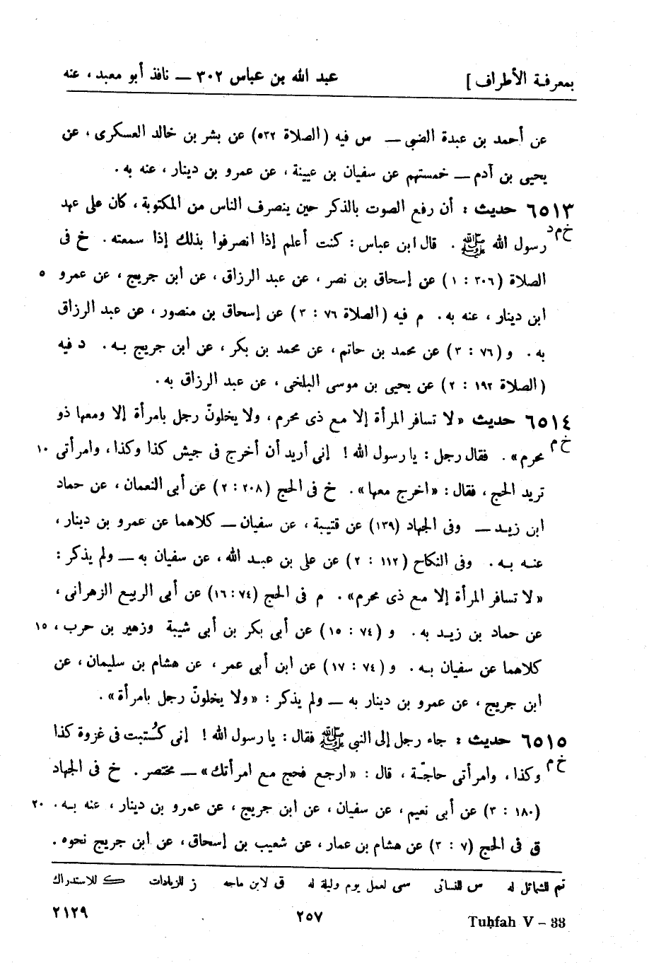 6514 -[خ م] حديث لا تسافر المرأة إلا مع ذي محرم، ولا يخلونّ رجل بامرأة إلا ومعها ذو محرم فقال رجل: يا رسول الله! إني أريد أن أخرج في جيش كذا وكذا، وامرأتي تريد الحج، فقال: اخرج معها (خ) في الحج (208: 2) عن أبي النعمان، عن حماد بن زيد - وفي الجهاد (139) عن قتيبة، عن سفيان - كلاهما عن عمرو بن دينار، عنه به. وفي النكاح (112: 2) عن علي بن عبد الله، عن سفيان به - ولم يذكر: لا تسافر المرأة إلا مع ذي محرم
