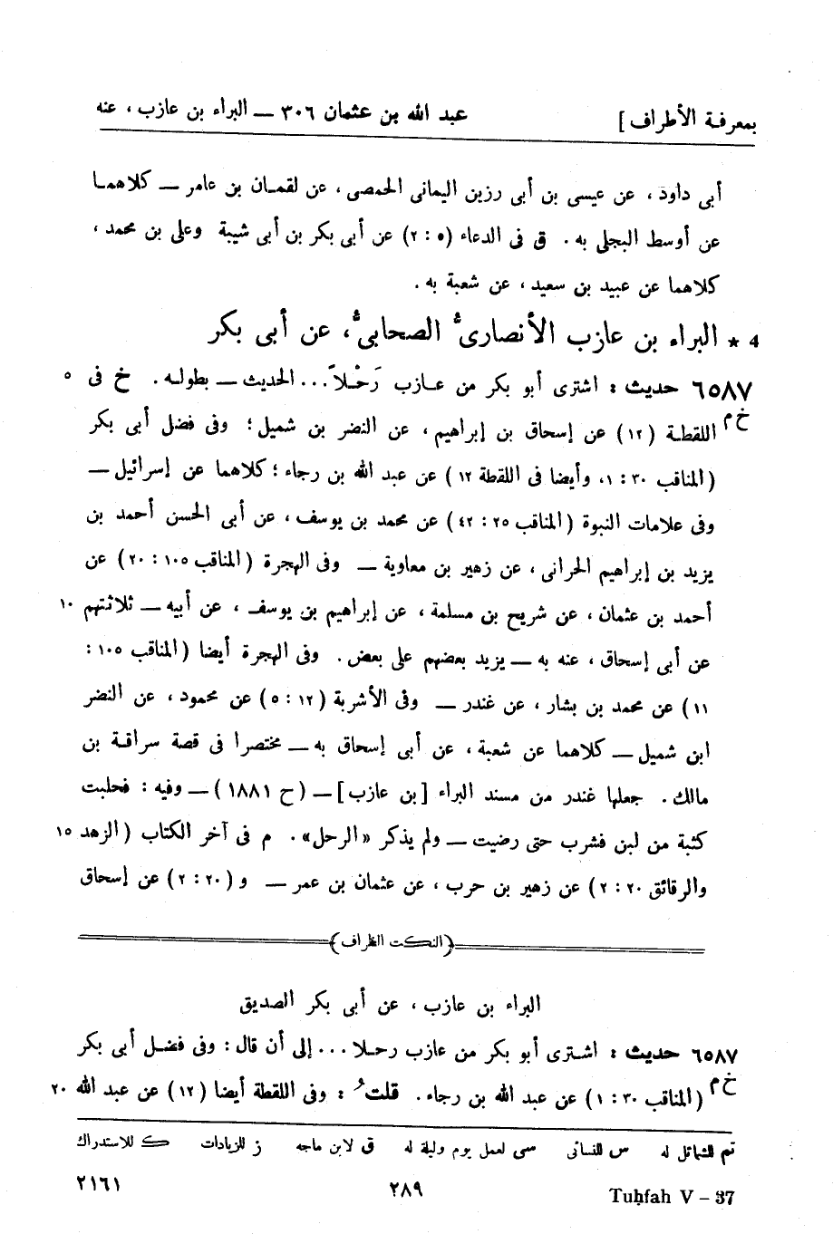 خ في اللقطة (12) عن إسحاق بن إبراهيم، عن النضر بن شميل، وفي فضل أبي بكر (المناقب 30: 1، وأيضاً في اللقطة 12) عن عبد الله بن رجاء، كلاهما عن إسرائيل - وفي علامات النبوة (المناقب 25: 42) عن محمد بن يوسف، عن أبي الحسن أحمد بن يزيد بن إبراهيم الحراني، عن زهير بن معاوية - وفي الهجرة (المناقب 105: 20) عن أحمد بن عثمان، عن شريح بن مسلمة، عن إبراهيم بن يوسف، عن أبيه - ثلاثتهم عن أبي إسحاق، عنه به - يزيد بعضهم على بعض. وفي الهجرة أيضاً (المناقب 105: 11) عن محمد بن بشار، عن غندر - وفي الأشربة (12: 5) عن محمود، عن النضر بن شميل - كلاهما عن شعبة، عن أبي إسحاق به - مختصراً في قصة سراقة بن مالك. جعلها غندر من مسند البراء [بن عازب]- (ح 1881) - وفيه: فحلبت كثبة من لبن فشرب حتى رضيت - ولم يذكر الرحل